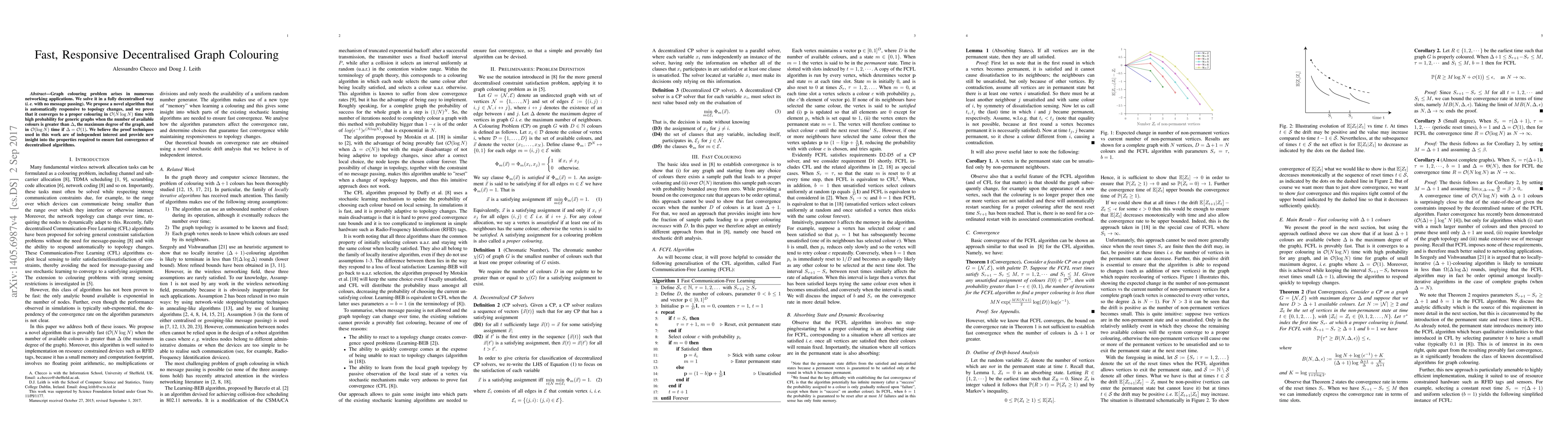 We solve, in a fully decentralised way (\ie with no message passing), the classic problem of colouring a graph. We propose a novel algorithm that is automatically responsive to topology changes, and we prove that it converges quickly to a proper colouring in $O(N\log{N})$ time with high probability for generic graphs (and in $O(\log{N})$ time if $\Delta=O(1)$) when the number of available colours is greater than $\Delta$, the maximum degree of the graph. We believe the proof techniques used in this work are of independent interest and provide new insight into the properties required to ensure fast convergence of decentralised algorithms.