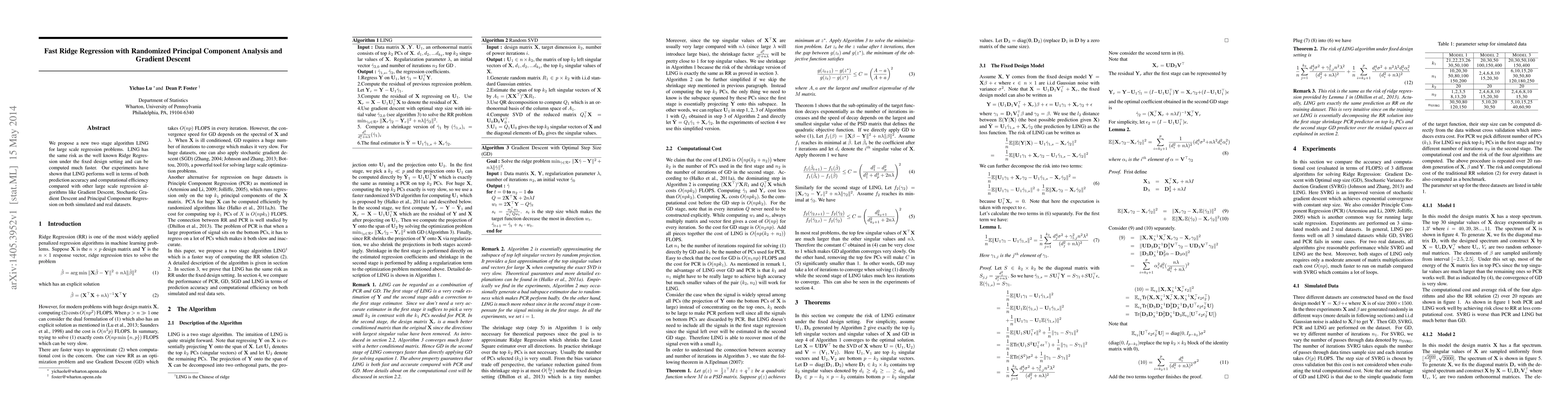 Summary: The paper introduces LING, a two-stage algorithm combining Randomized Principal Component Analysis and Gradient Descent for fast Ridge Regression in large-scale problems. LING matches Ridge Regression's risk and outperforms other methods in terms of prediction accuracy and computational efficiency.