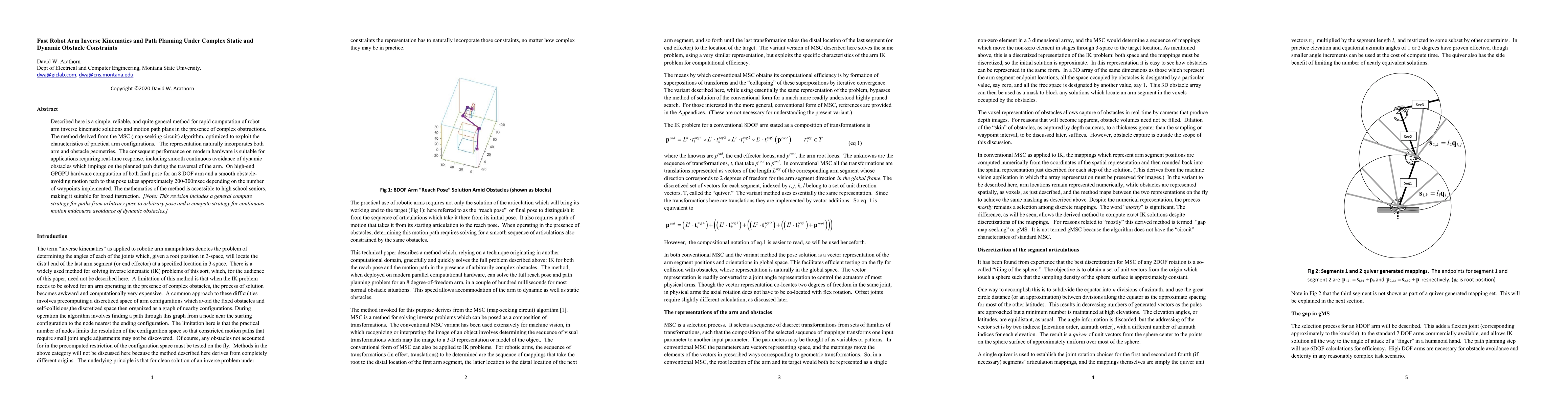 Researchers developed a fast method for robot arm inverse kinematics and path planning that can handle complex static and dynamic obstacle constraints, achieving real-time response on modern hardware.