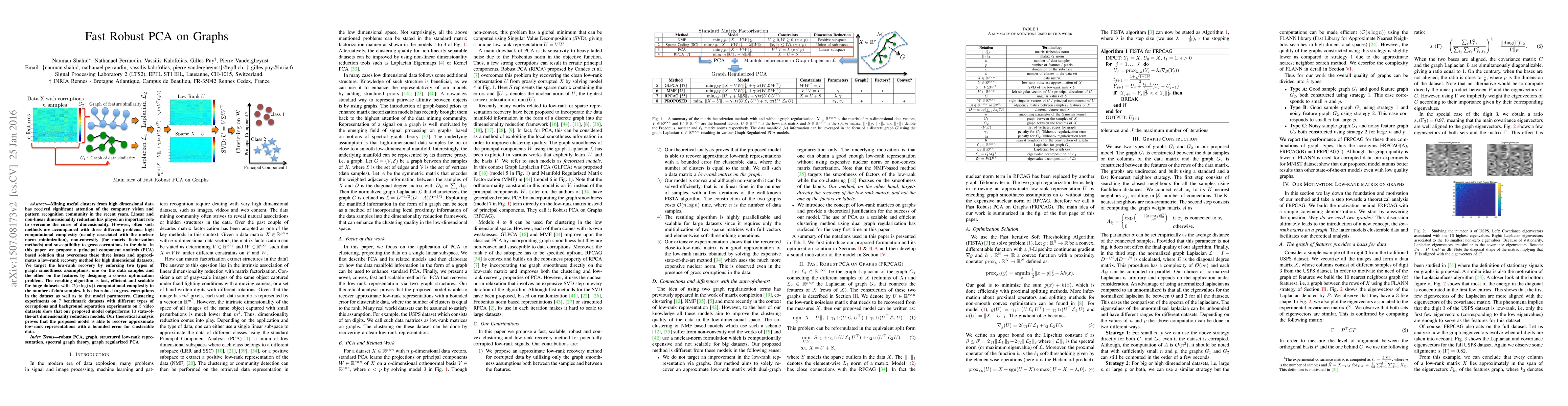 This paper proposes a fast, robust PCA-based method for low-rank recovery on graphs, addressing computational complexity, non-convexity, and data corruption issues. The method leverages graph smoothness and convex optimization, achieving O(nlog(n)) complexity and outperforming state-of-the-art models in clustering and background separation tasks.