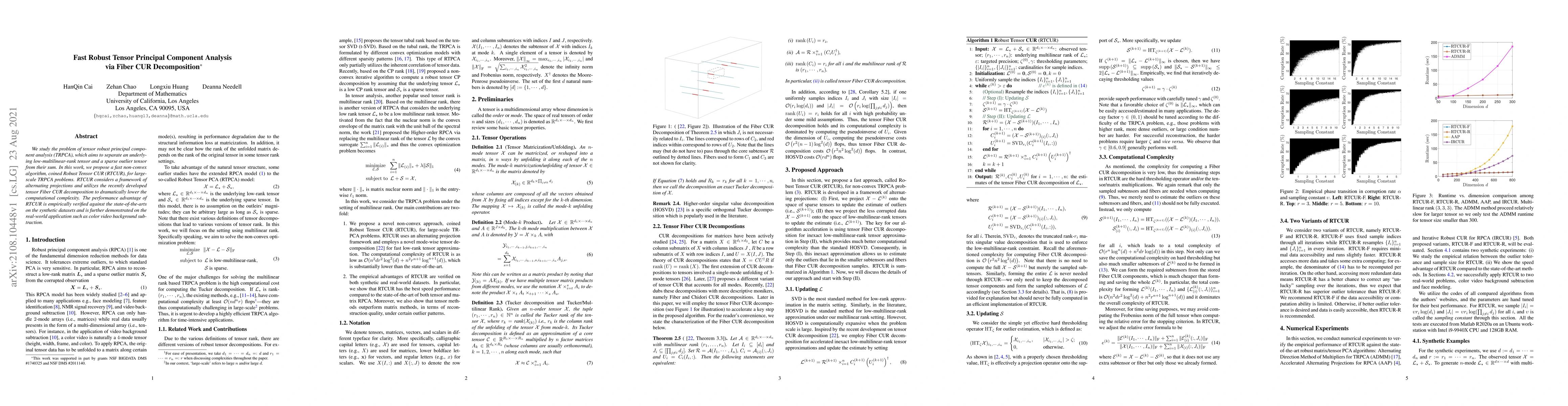 This paper proposes a fast non-convex algorithm, RTCUR, for tensor robust principal component analysis (TRPCA) using tensor Fiber CUR decomposition to reduce computational complexity. The method is shown to outperform state-of-the-art techniques on synthetic datasets and in real-world applications like color video background subtraction.