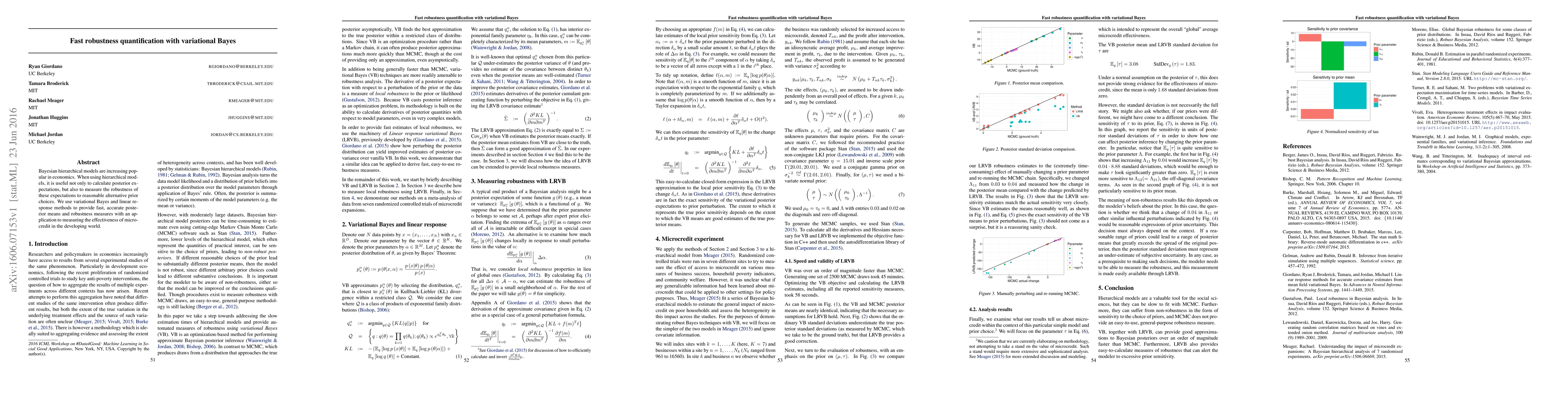This research uses variational Bayes to provide fast and accurate posterior means and robustness measures for Bayesian hierarchical models, with applications in economics such as evaluating microcredit effectiveness.