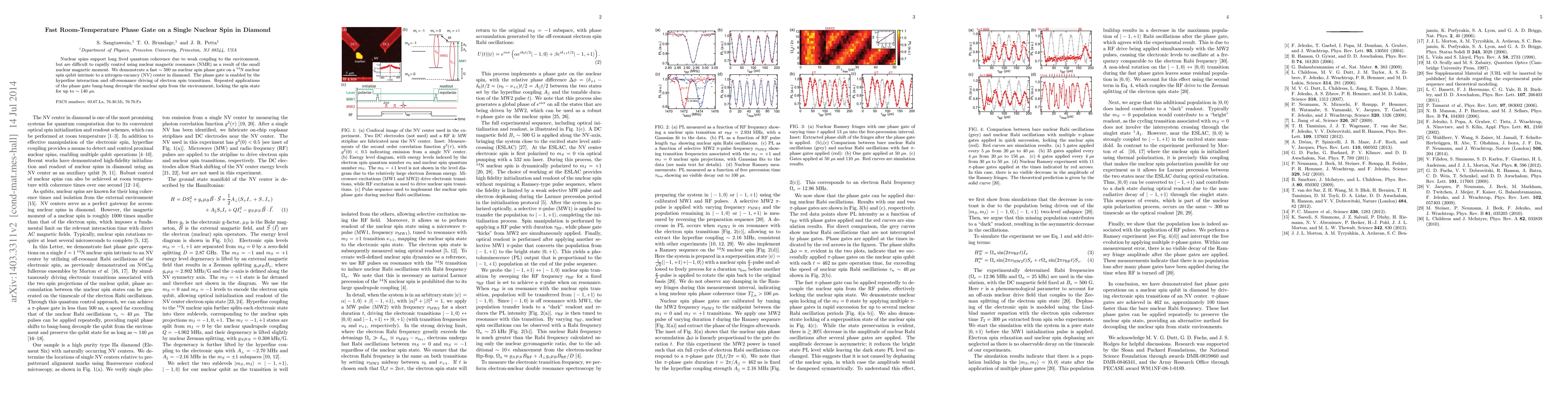 This paper demonstrates a fast ~500 ns nuclear spin phase gate on a 14N nuclear spin qubit within a nitrogen-vacancy center in diamond, utilizing hyperfine interaction and off-resonance driving of electron spin transitions to achieve decoupling and lock the nuclear spin state for up to ~140 microseconds.