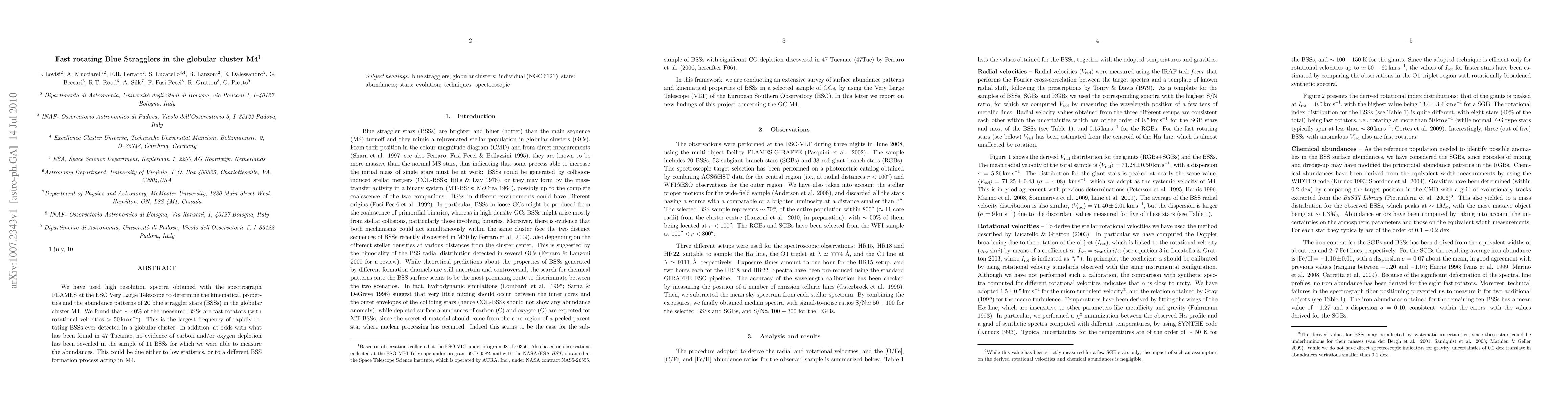 A study of blue straggler stars in the globular cluster M4 found that 40% of them rotate rapidly (over 50 km/s), a higher frequency than previously detected, with no evidence of carbon and oxygen depletion.