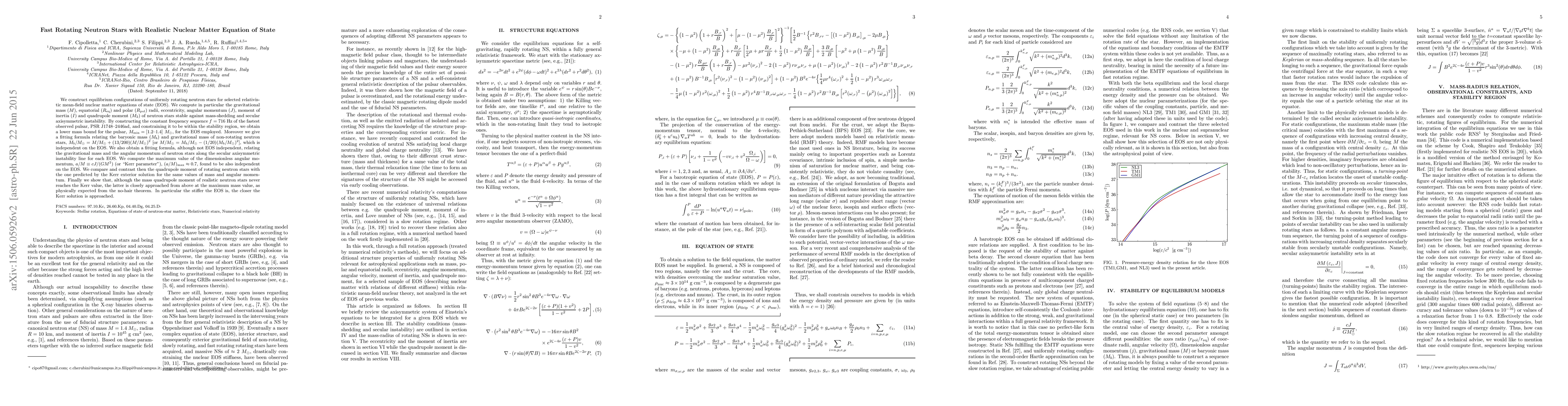 We construct equilibrium configurations of uniformly rotating neutron stars for selected relativistic mean-field nuclear matter equations of state (EOS). We compute in particular the gravitational mass ($M$), equatorial ($R_{\rm eq}$) and polar ($R_{\rm pol}$) radii, eccentricity, angular momentum ($J$), moment of inertia ($I$) and quadrupole moment ($M_2$) of neutron stars stable against mass-shedding and secular axisymmetric instability. By constructing the constant frequency sequence $f=716$ Hz of the fastest observed pulsar, PSR J1748-2446ad, and constraining it to be within the stability region, we obtain a lower mass bound for the pulsar, $M_{\rm min}=[1.2$-$1.4] M_\odot$, for the EOS employed. Moreover we give a fitting formula relating the baryonic mass ($M_b$) and gravitational mass of non-rotating neutron stars, $M_b/M_\odot=M/M_\odot+(13/200)(M/M_\odot)^2$ [or $M/M_\odot=M_b/M_\odot-(1/20)(M_b/M_\odot)^2$], which is independent on the EOS. We also obtain a fitting formula, although not EOS independent, relating the gravitational mass and the angular momentum of neutron stars along the secular axisymmetric instability line for each EOS. We compute the maximum value of the dimensionless angular momentum, $a/M\equiv c J/(G M^2)$ (or "Kerr parameter"), $(a/M)_{\rm max}\approx 0.7$, found to be also independent on the EOS. We compare and contrast then the quadrupole moment of rotating neutron stars with the one predicted by the Kerr exterior solution for the same values of mass and angular momentum. Finally we show that, although the mass quadrupole moment of realistic neutron stars never reaches the Kerr value, the latter is closely approached from above at the maximum mass value, as physically expected from the no-hair theorem. In particular the stiffer the EOS is, the closer the Kerr solution is approached.