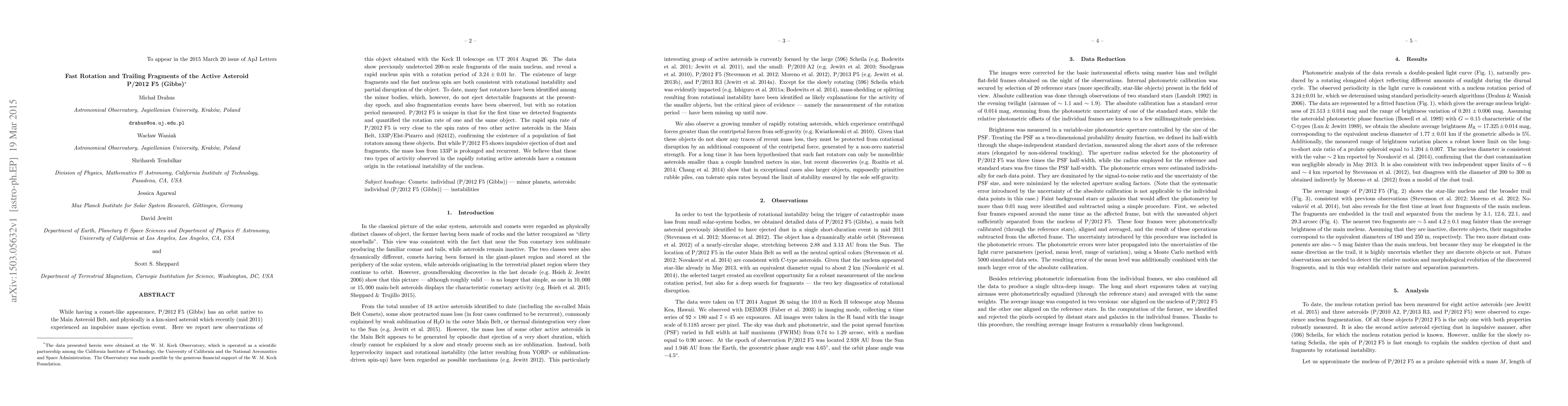 While having a comet-like appearance, P/2012 F5 (Gibbs) has an orbit native to the Main Asteroid Belt, and physically is a km-sized asteroid which recently (mid 2011) experienced an impulsive mass ejection event. Here we report new observations of this object obtained with the Keck II telescope on UT 2014 August 26. The data show previously undetected 200-m scale fragments of the main nucleus, and reveal a rapid nucleus spin with a rotation period of 3.24 $\pm$ 0.01 hr. The existence of large fragments and the fast nucleus spin are both consistent with rotational instability and partial disruption of the object. To date, many fast rotators have been identified among the minor bodies, which, however, do not eject detectable fragments at the present-day epoch, and also fragmentation events have been observed, but with no rotation period measured. P/2012 F5 is unique in that for the first time we detected fragments and quantified the rotation rate of one and the same object. The rapid spin rate of P/2012 F5 is very close to the spin rates of two other active asteroids in the Main Belt, 133P/Elst-Pizarro and (62412), confirming the existence of a population of fast rotators among these objects. But while P/2012 F5 shows impulsive ejection of dust and fragments, the mass loss from 133P is prolonged and recurrent. We believe that these two types of activity observed in the rapidly rotating active asteroids have a common origin in the rotational instability of the nucleus.
