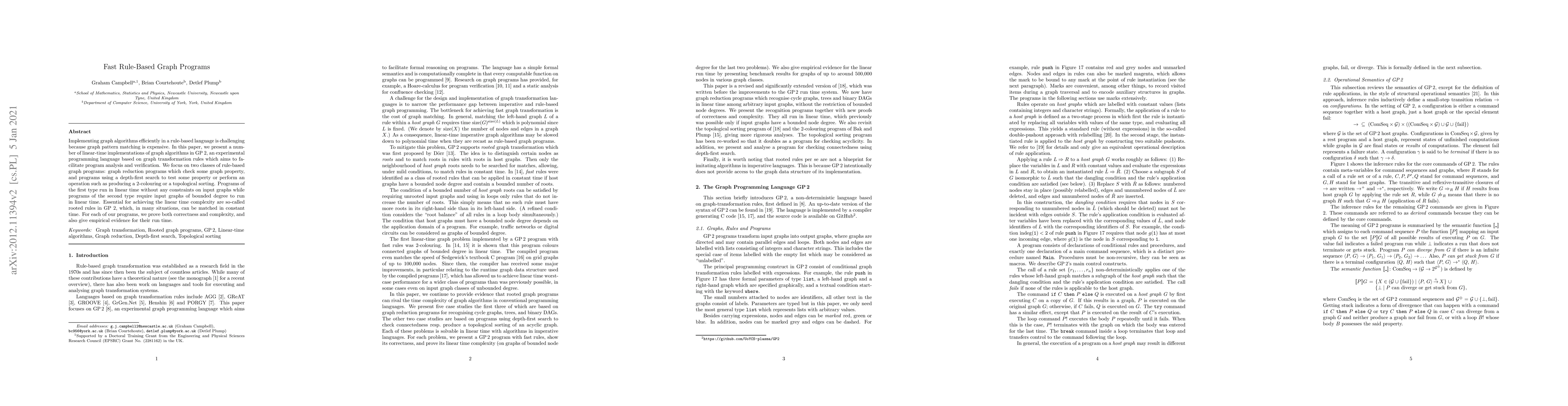 This paper presents linear-time implementations of graph algorithms in GP 2, a rule-based language for graph transformation, focusing on graph reduction and depth-first search programs. It introduces rooted rules that enable efficient pattern matching, ensuring linear runtime for certain classes of graph algorithms.