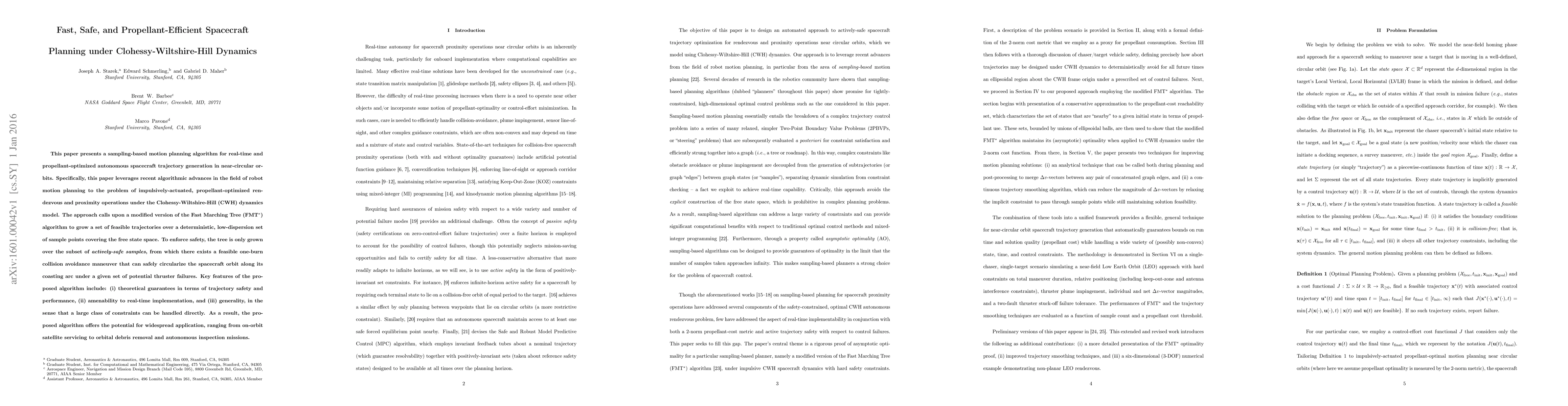 This paper introduces a real-time, propellant-efficient motion planning algorithm for spacecraft trajectory generation using the Clohessy-Wiltshire-Hill dynamics, leveraging the Fast Marching Tree algorithm to ensure safety and feasibility under potential thruster failures. The approach guarantees safe, optimal trajectories for a variety of space missions.