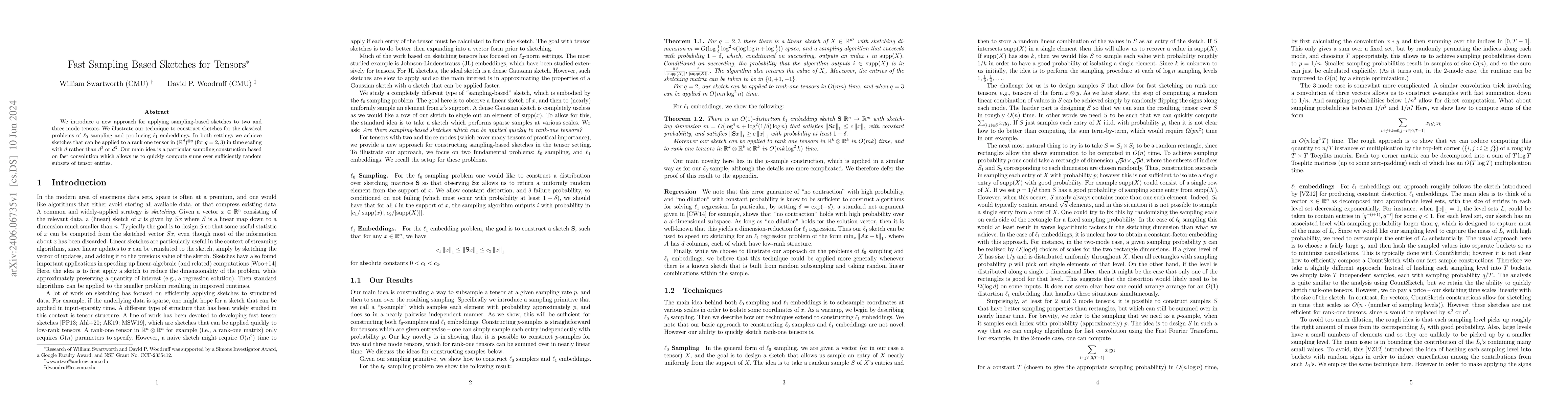 We introduce a new approach for applying sampling-based sketches to two and three mode tensors. We illustrate our technique to construct sketches for the classical problems of $\ell_0$ sampling and producing $\ell_1$ embeddings. In both settings we achieve sketches that can be applied to a rank one tensor in $(\mathbb{R}^d)^{\otimes q}$ (for $q=2,3$) in time scaling with $d$ rather than $d^2$ or $d^3$. Our main idea is a particular sampling construction based on fast convolution which allows us to quickly compute sums over sufficiently random subsets of tensor entries.