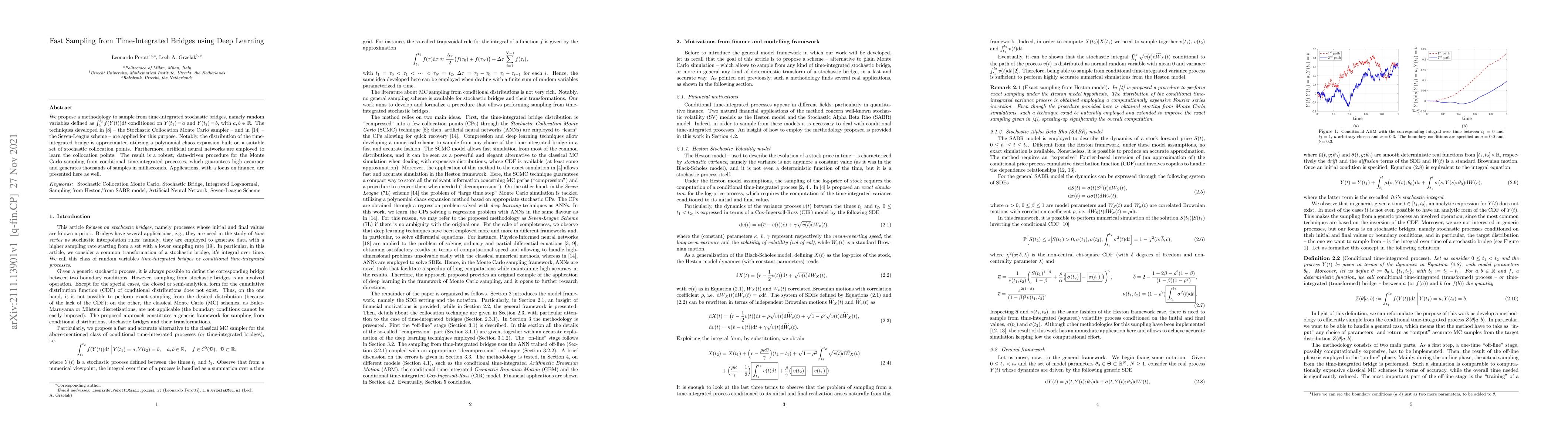 We propose a methodology to sample from time-integrated stochastic bridges, namely random variables defined as $\int_{t_1}^{t_2} f(Y(t))dt$ conditioned on $Y(t_1)\!=\!a$ and $Y(t_2)\!=\!b$, with $a,b\in R$. The Stochastic Collocation Monte Carlo sampler and the Seven-League scheme are applied for this purpose. Notably, the distribution of the time-integrated bridge is approximated utilizing a polynomial chaos expansion built on a suitable set of stochastic collocation points. Furthermore, artificial neural networks are employed to learn the collocation points. The result is a robust, data-driven procedure for the Monte Carlo sampling from conditional time-integrated processes, which guarantees high accuracy and generates thousands of samples in milliseconds. Applications, with a focus on finance, are presented here as well.