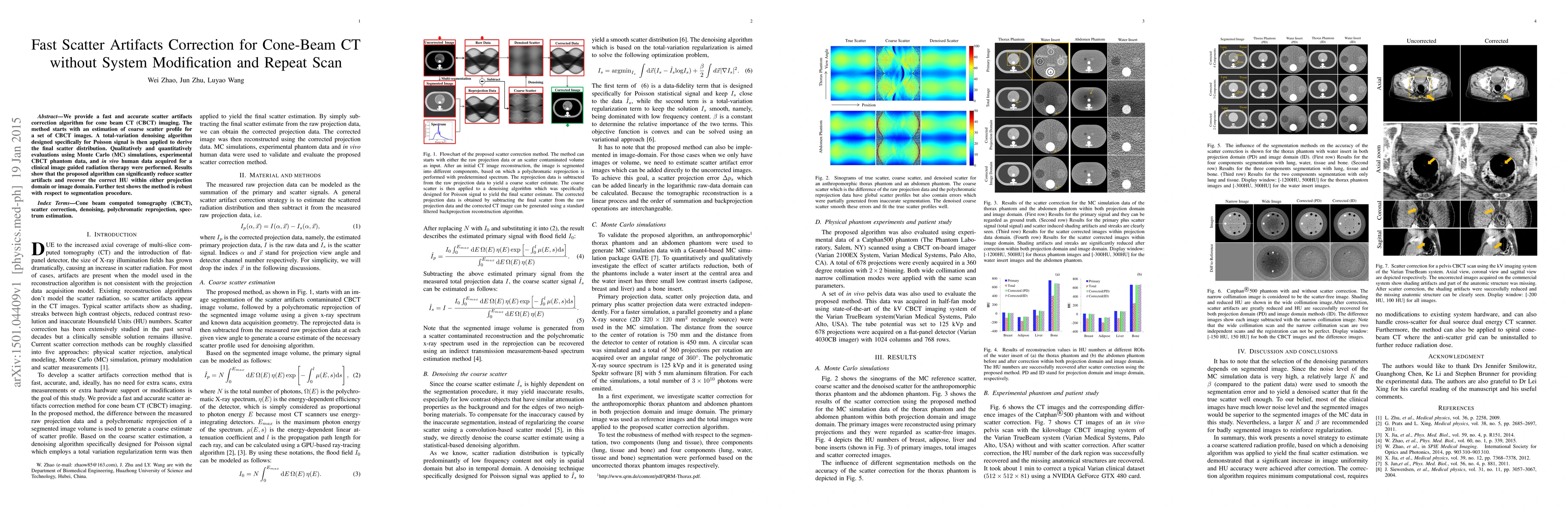 This paper presents a fast scatter artifacts correction algorithm for cone beam CT (CBCT) that estimates a coarse scatter profile and applies a total-variation denoising method for accurate correction. Evaluations using simulations and real data demonstrate significant reduction in scatter artifacts and improved HU recovery.