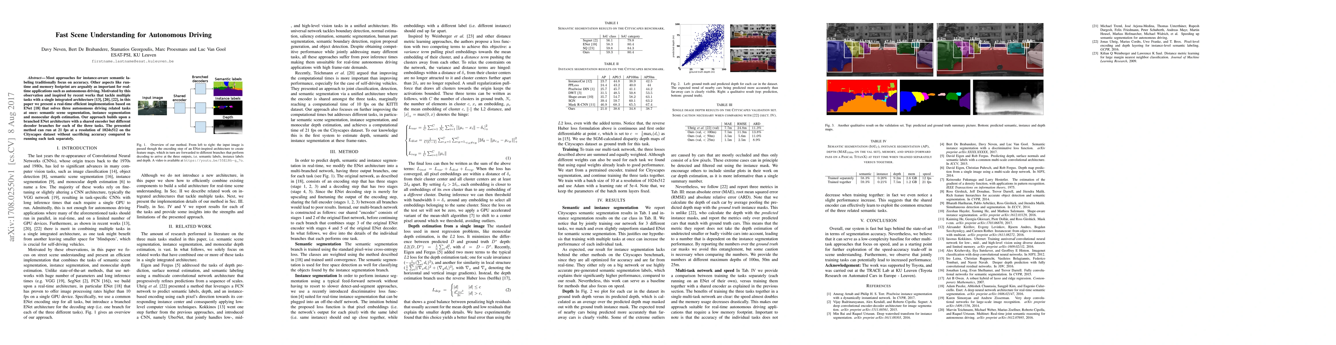 This paper proposes a real-time efficient ENet-based architecture that concurrently performs semantic scene segmentation, instance segmentation, and monocular depth estimation for autonomous driving, achieving 21 fps at 1024x512 resolution without compromising accuracy compared to separate task implementations.