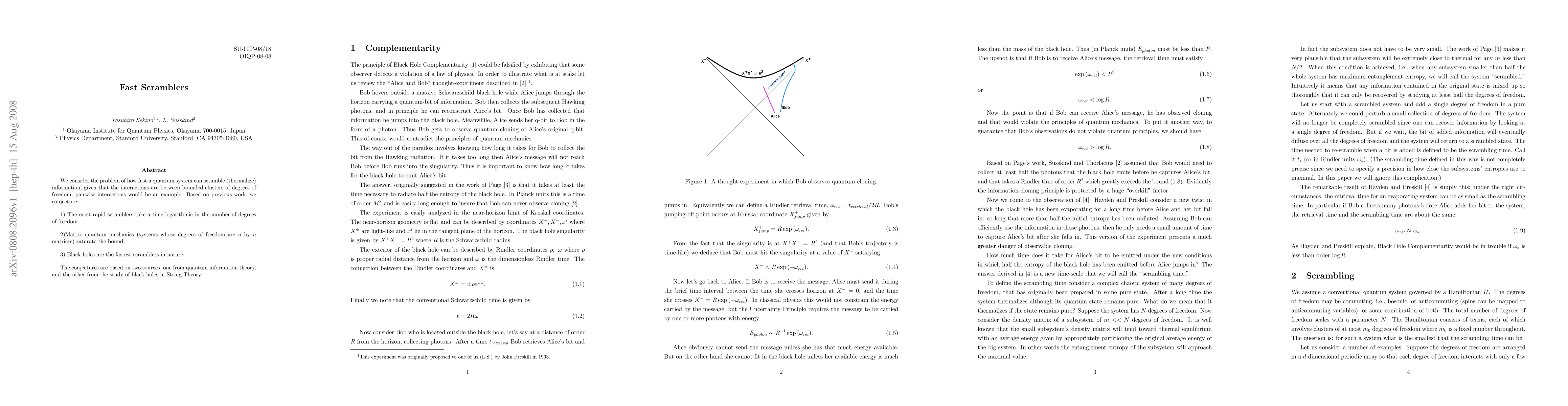 We consider the problem of how fast a quantum system can scramble (thermalize) information, given that the interactions are between bounded clusters of degrees of freedom; pairwise interactions would be an example. Based on previous work, we conjecture: 1) The most rapid scramblers take a time logarithmic in the number of degrees of freedom. 2) Matrix quantum mechanics (systems whose degrees of freedom are n by n matrices) saturate the bound. 3) Black holes are the fastest scramblers in nature. The conjectures are based on two sources, one from quantum information theory, and the other from the study of black holes in String Theory.