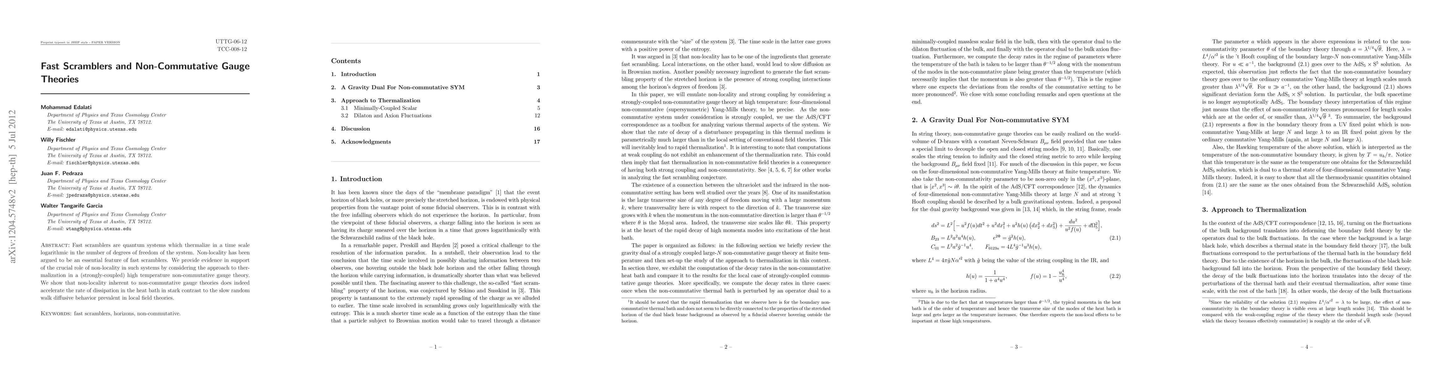 This paper investigates fast scramblers in quantum systems, demonstrating that non-locality accelerates thermalization in strongly-coupled high temperature non-commutative gauge theories compared to local field theories. Evidence supports the essential role of non-locality in the rapid dissipation seen in these systems.