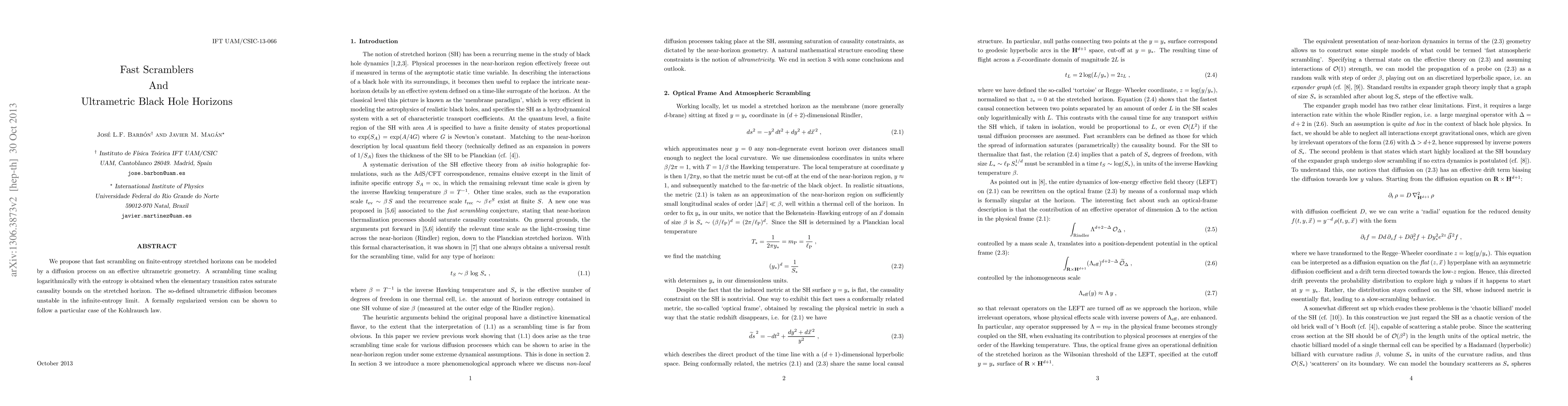 We propose that fast scrambling on finite-entropy stretched horizons can be modeled by a diffusion process on an effective ultrametric geometry. A scrambling time scaling logarithmically with the entropy is obtained when the elementary transition rates saturate causality bounds on the stretched horizon. The so-defined ultrametric diffusion becomes unstable in the infinite-entropy limit. A formally regularized version can be shown to follow a particular case of the Kohlrausch law.
