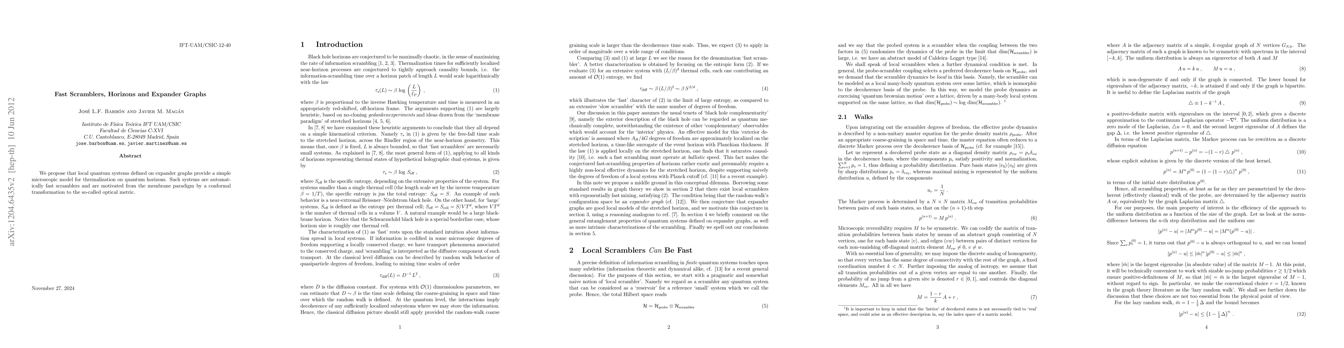 This paper proposes that local quantum systems on expander graphs serve as a simple microscopic model for thermalization on quantum horizons, leveraging the membrane paradigm and conformal transformations to the optical metric, which inherently fast scramble information.