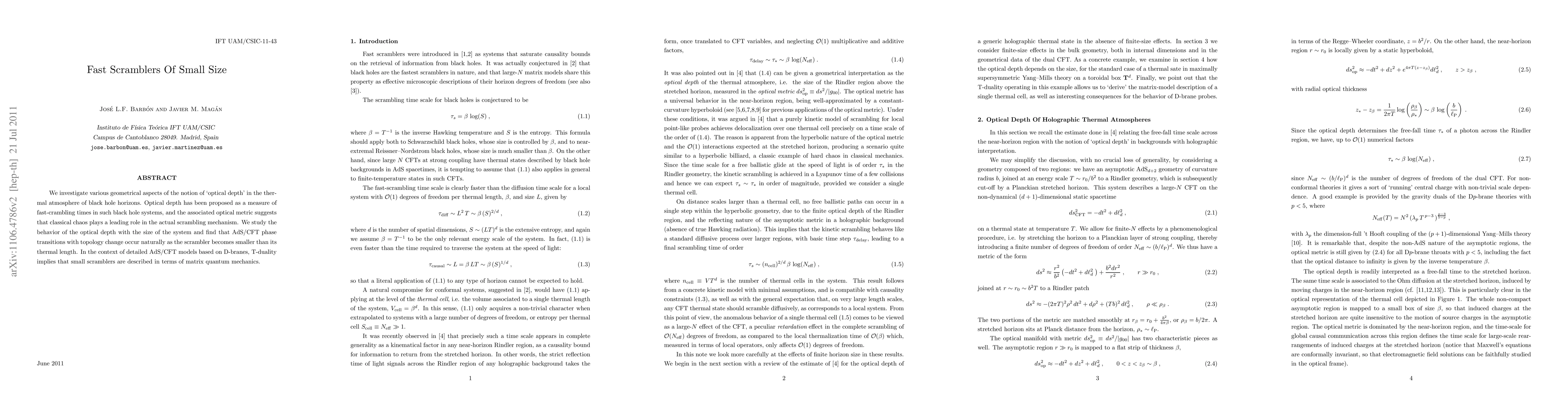 We investigate various geometrical aspects of the notion of `optical depth' in the thermal atmosphere of black hole horizons. Optical depth has been proposed as a measure of fast-crambling times in such black hole systems, and the associated optical metric suggests that classical chaos plays a leading role in the actual scrambling mechanism. We study the behavior of the optical depth with the size of the system and find that AdS/CFT phase transitions with topology change occur naturally as the scrambler becomes smaller than its thermal length. In the context of detailed AdS/CFT models based on D-branes, T-duality implies that small scramblers are described in terms of matrix quantum mechanics.