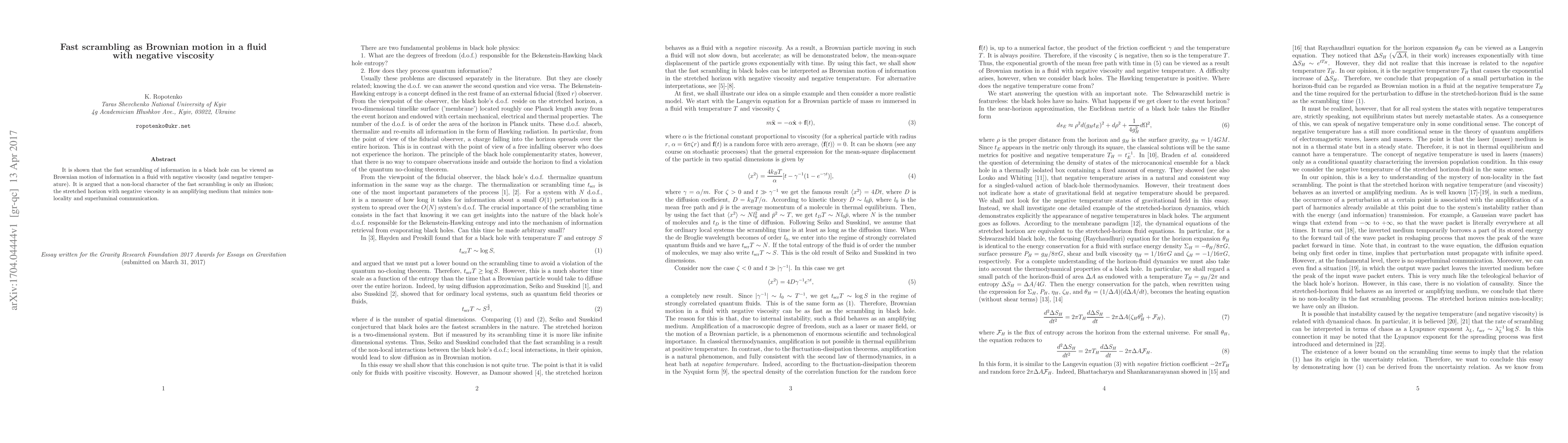 It is shown that the fast scrambling of information in a black hole can be viewed as Brownian motion of information in a fluid with negative viscosity (and negative temperature). It is argued that a non-local character of the fast scrambling is only an illusion; the stretched horizon with negative viscosity is an amplifying medium that mimics non-locality and superluminal communication.