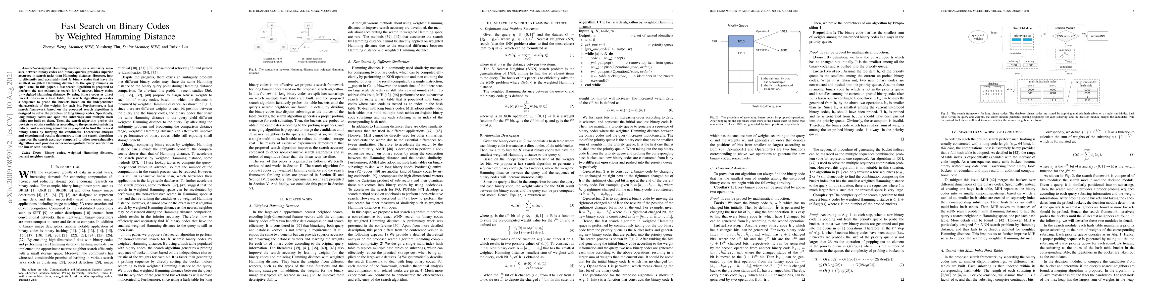 This paper proposes a fast search algorithm for finding $K$ nearest binary codes based on weighted Hamming distance using a hash table approach. The method splits long binary codes into substrings and employs multiple hash tables to significantly speed up the search process, achieving both higher accuracy and faster search times compared to existing non-exhaustive algorithms.