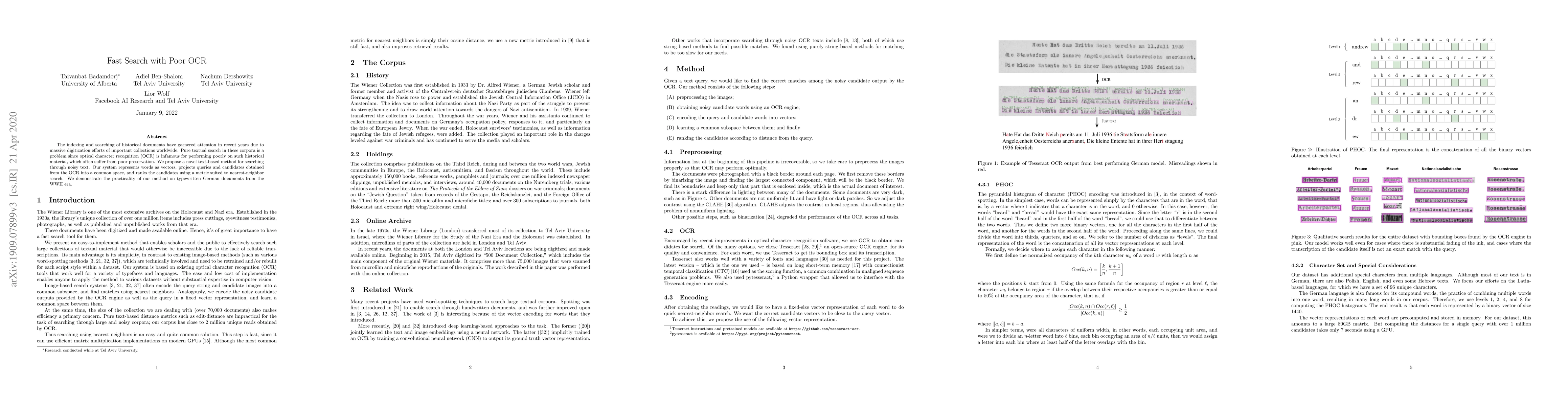 The indexing and searching of historical documents have garnered attention in recent years due to massive digitization efforts of important collections worldwide. Pure textual search in these corpora is a problem since optical character recognition (OCR) is infamous for performing poorly on such historical material, which often suffer from poor preservation. We propose a novel text-based method for searching through noisy text. Our system represents words as vectors, projects queries and candidates obtained from the OCR into a common space, and ranks the candidates using a metric suited to nearest-neighbor search. We demonstrate the practicality of our method on typewritten German documents from the WWII era.
