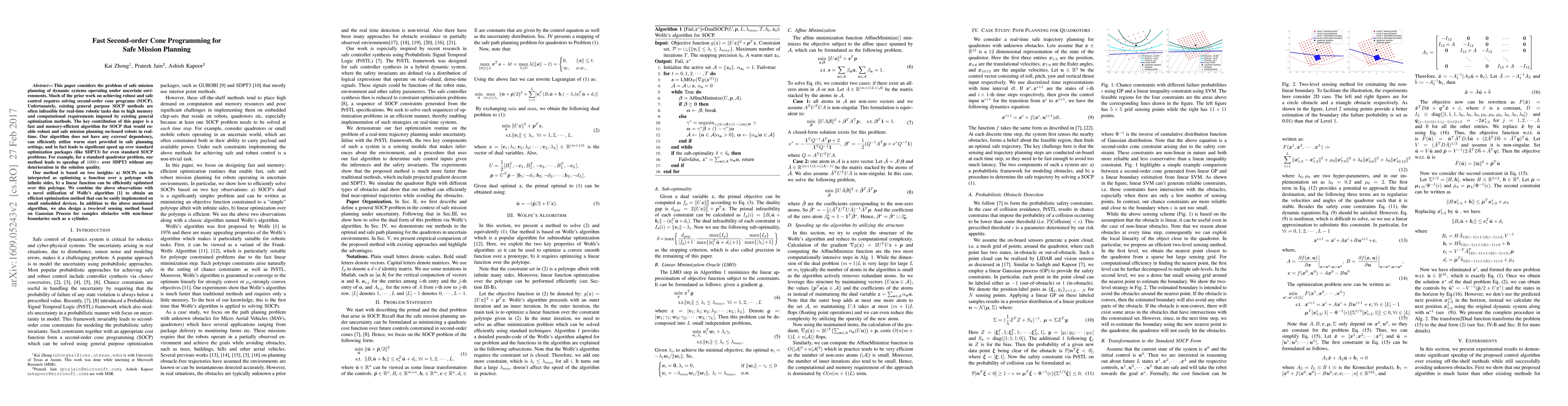 This paper considers the problem of safe mission planning of dynamic systems operating under uncertain environments. Much of the prior work on achieving robust and safe control requires solving second-order cone programs (SOCP). Unfortunately, existing general purpose SOCP methods are often infeasible for real-time robotic tasks due to high memory and computational requirements imposed by existing general optimization methods. The key contribution of this paper is a fast and memory-efficient algorithm for SOCP that would enable robust and safe mission planning on-board robots in real-time. Our algorithm does not have any external dependency, can efficiently utilize warm start provided in safe planning settings, and in fact leads to significant speed up over standard optimization packages (like SDPT3) for even standard SOCP problems. For example, for a standard quadrotor problem, our method leads to speedup of 1000x over SDPT3 without any deterioration in the solution quality. Our method is based on two insights: a) SOCPs can be interpreted as optimizing a function over a polytope with infinite sides, b) a linear function can be efficiently optimized over this polytope. We combine the above observations with a novel utilization of Wolfe's algorithm to obtain an efficient optimization method that can be easily implemented on small embedded devices. In addition to the above mentioned algorithm, we also design a two-level sensing method based on Gaussian Process for complex obstacles with non-linear boundaries such as a cylinder.