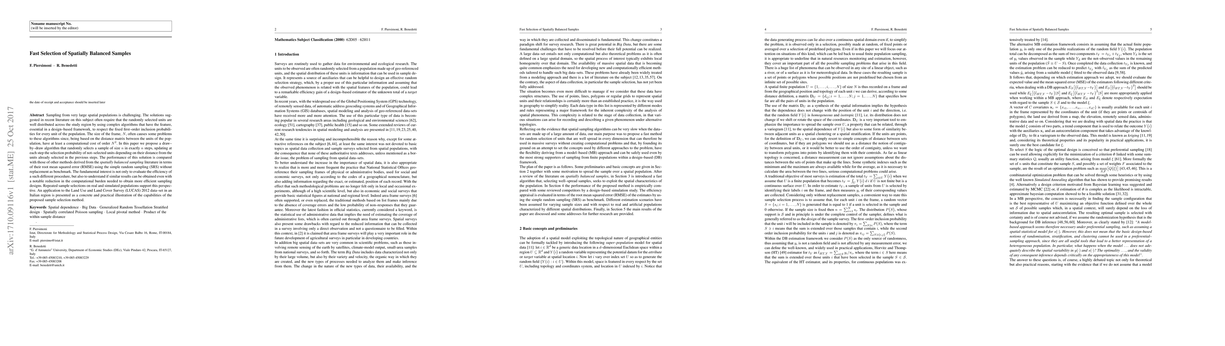 This paper proposes a draw-by-draw algorithm for selecting spatially balanced samples in $N$ steps, contrasting it with existing methods that have $O(N^2)$ computational costs. The proposed method's efficiency is evaluated against simple random sampling in terms of RMSE, demonstrating comparable results with significantly lower computational demands.