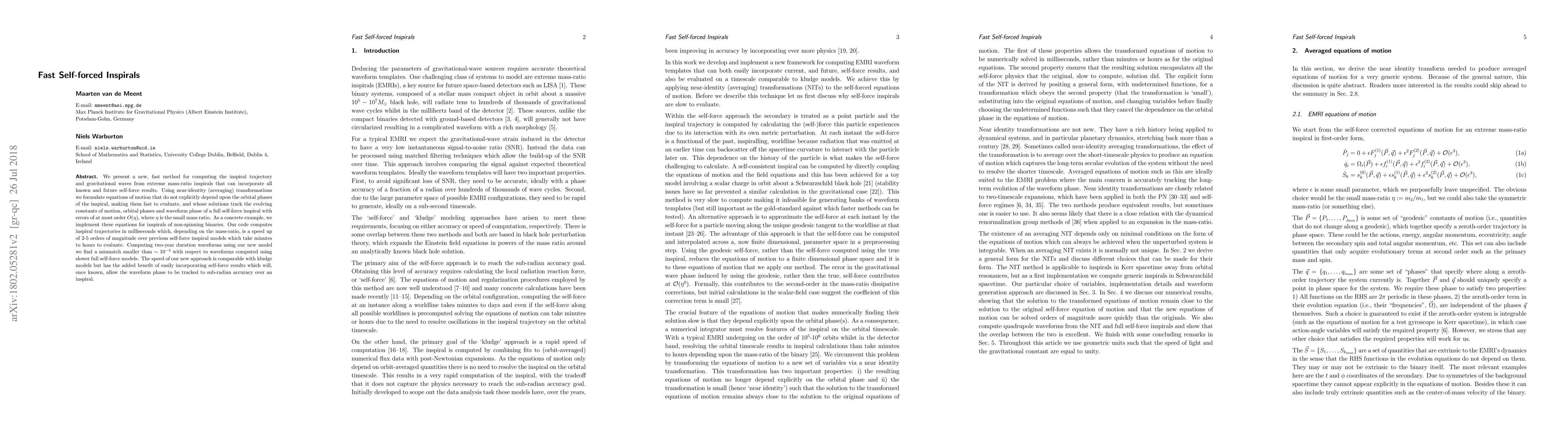 We present a new, fast method for computing the inspiral trajectory and gravitational waves from extreme mass-ratio inspirals that can incorporate all known (and future) self-force results. Using near-identity (averaging) transformations we formulate equations of motion that do not explicitly depend upon the orbital phases of the inspiral, making them fast to evaluate, and whose solutions track the evolving constants of motion, orbital phases and waveform phase of a full self-force inspiral to $O(\eta)$, where $\eta$ is the (small) mass ratio. As a concrete example, we implement these equations for inspirals of non-spinning (Schwarzschild) binaries. Our code computes inspiral trajectories in milliseconds which is a speed up of 2-5 orders of magnitude (depending on the mass-ratio) over previous self-force inspiral models which take minutes to hours to evaluate. Computing two-year duration waveforms using our new model we find a mismatch better than $\sim 10^{-4}$ with respect to waveforms computed using the (slower) full self-force models. The speed of our new approach is comparable with kludge models but has the added benefit of easily incorporating self-force results which will, once known, allow the waveform phase to be tracked to sub-radian accuracy over an inspiral.