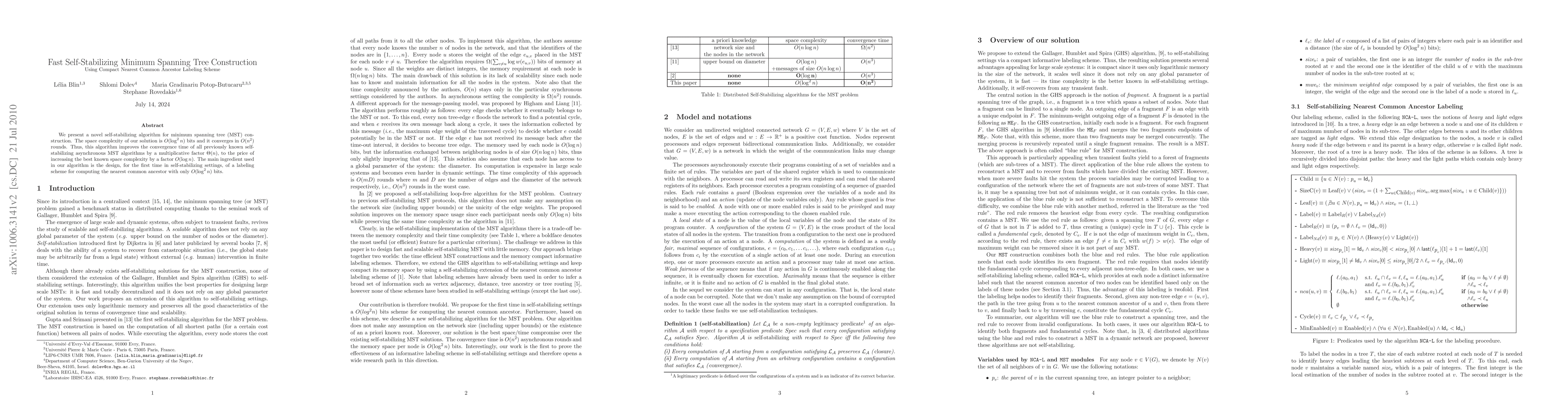 This paper introduces a self-stabilizing algorithm for constructing minimum spanning trees (MST) with a space complexity of $O(\log^2n)$ bits and convergence in $O(n^2)$ rounds, significantly improving previous algorithms' convergence time by a factor of $\Theta(n)$. The key innovation is a novel labeling scheme for computing the nearest common ancestor.