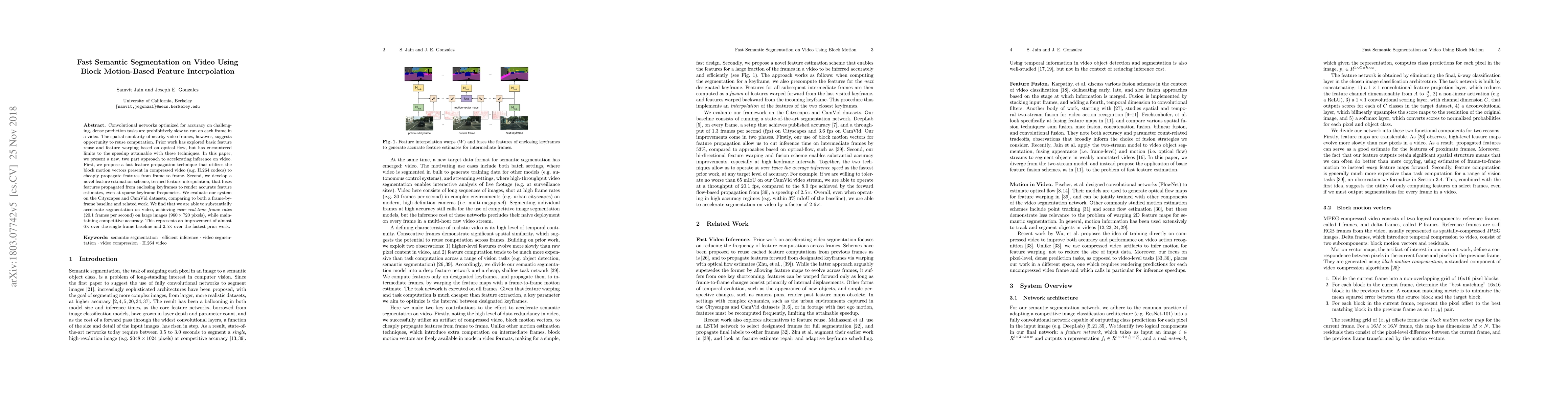 This paper proposes a two-part method to accelerate semantic segmentation on video by leveraging block motion-based feature interpolation and propagation, achieving near real-time speeds with substantial improvements over single-frame baselines and prior work.