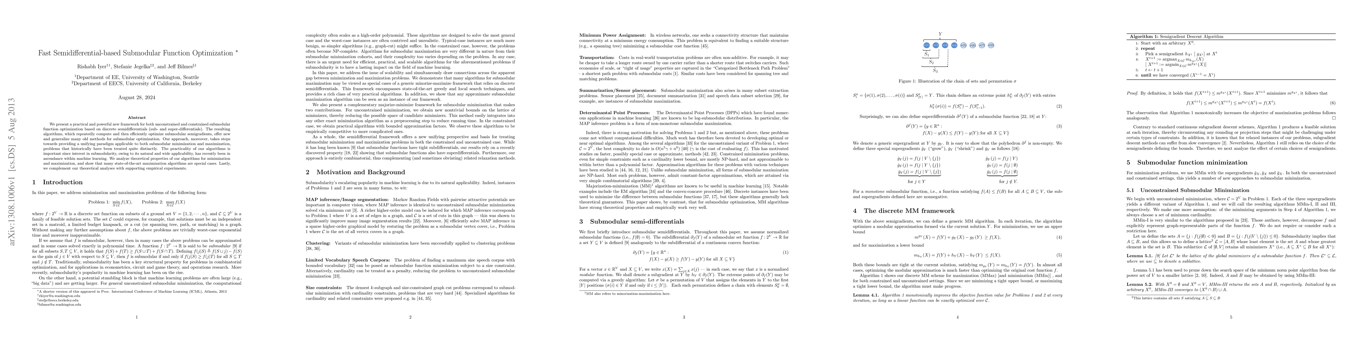 We present a practical and powerful new framework for both unconstrained and constrained submodular function optimization based on discrete semidifferentials (sub- and super-differentials). The resulting algorithms, which repeatedly compute and then efficiently optimize submodular semigradients, offer new and generalize many old methods for submodular optimization. Our approach, moreover, takes steps towards providing a unifying paradigm applicable to both submodular min- imization and maximization, problems that historically have been treated quite distinctly. The practicality of our algorithms is important since interest in submodularity, owing to its natural and wide applicability, has recently been in ascendance within machine learning. We analyze theoretical properties of our algorithms for minimization and maximization, and show that many state-of-the-art maximization algorithms are special cases. Lastly, we complement our theoretical analyses with supporting empirical experiments.