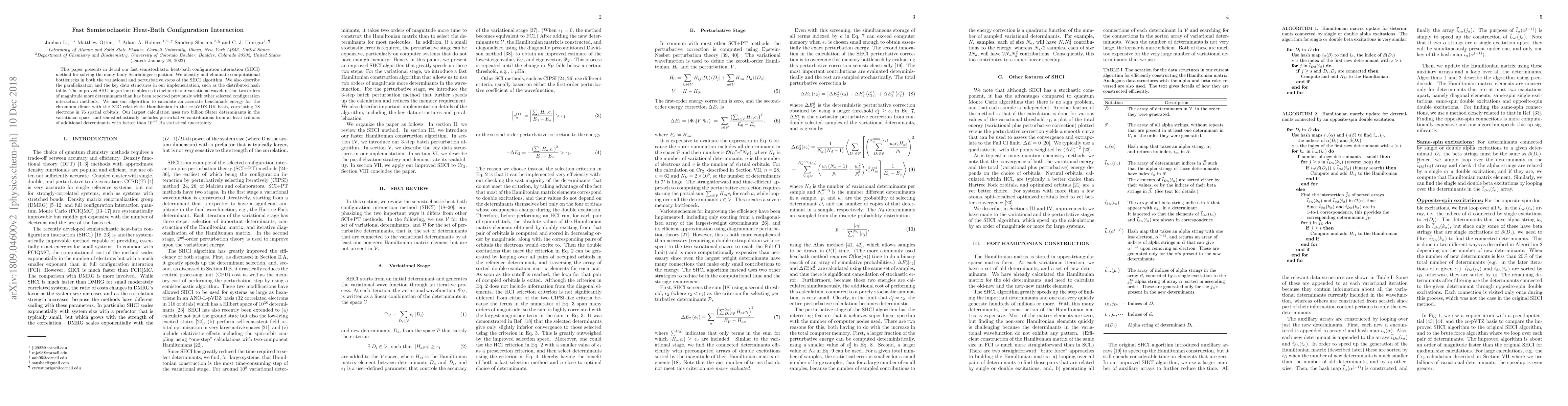 This paper introduces a fast semistochastic heat-bath configuration interaction (SHCI) method to solve the many-body Schrödinger equation, significantly improving computational efficiency and enabling the inclusion of two orders of magnitude more determinants than previous methods. The authors achieve this by optimizing both variational and perturbative steps and implementing parallelization with distributed data structures.