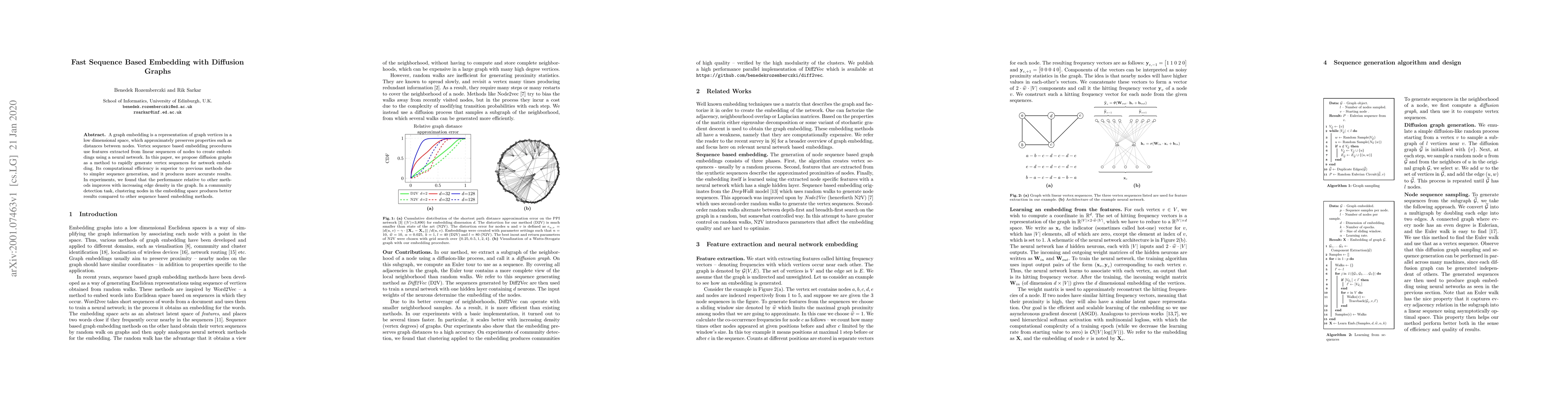 This paper proposes a novel diffusion graph method for fast sequence-based graph embedding, which generates vertex sequences more efficiently than previous methods while achieving higher accuracy. The approach shows improved performance in community detection tasks, especially in denser graphs.