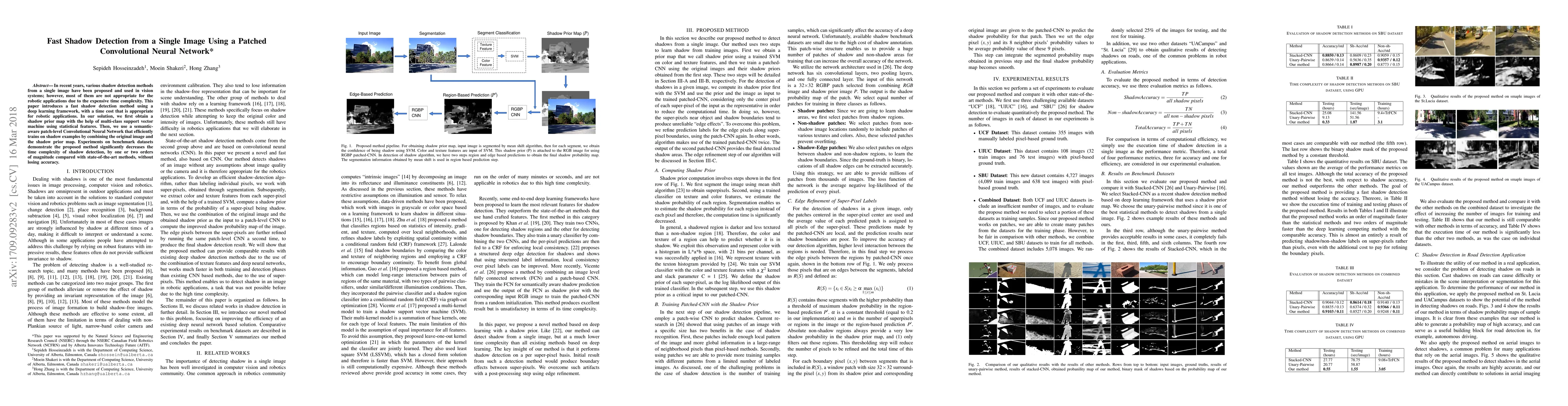 In recent years, various shadow detection methods from a single image have been proposed and used in vision systems; however, most of them are not appropriate for the robotic applications due to the expensive time complexity. This paper introduces a fast shadow detection method using a deep learning framework, with a time cost that is appropriate for robotic applications. In our solution, we first obtain a shadow prior map with the help of multi-class support vector machine using statistical features. Then, we use a semantic- aware patch-level Convolutional Neural Network that efficiently trains on shadow examples by combining the original image and the shadow prior map. Experiments on benchmark datasets demonstrate the proposed method significantly decreases the time complexity of shadow detection, by one or two orders of magnitude compared with state-of-the-art methods, without losing accuracy.