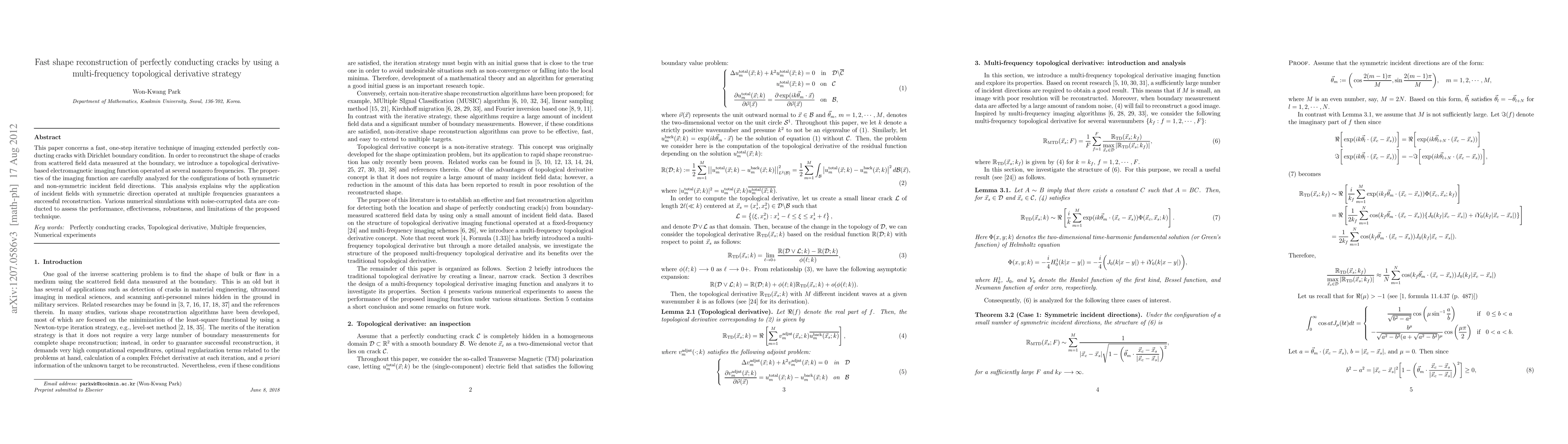 This paper concerns a fast, one-step iterative technique of imaging extended perfectly conducting cracks with Dirichlet boundary condition. In order to reconstruct the shape of cracks from scattered field data measured at the boundary, we introduce a topological derivative-based electromagnetic imaging function operated at several nonzero frequencies. The properties of the imaging function are carefully analyzed for the configurations of both symmetric and non-symmetric incident field directions. This analysis explains why the application of incident fields with symmetric direction operated at multiple frequencies guarantees a successful reconstruction. Various numerical simulations with noise-corrupted data are conducted to assess the performance, effectiveness, robustness, and limitations of the proposed technique.