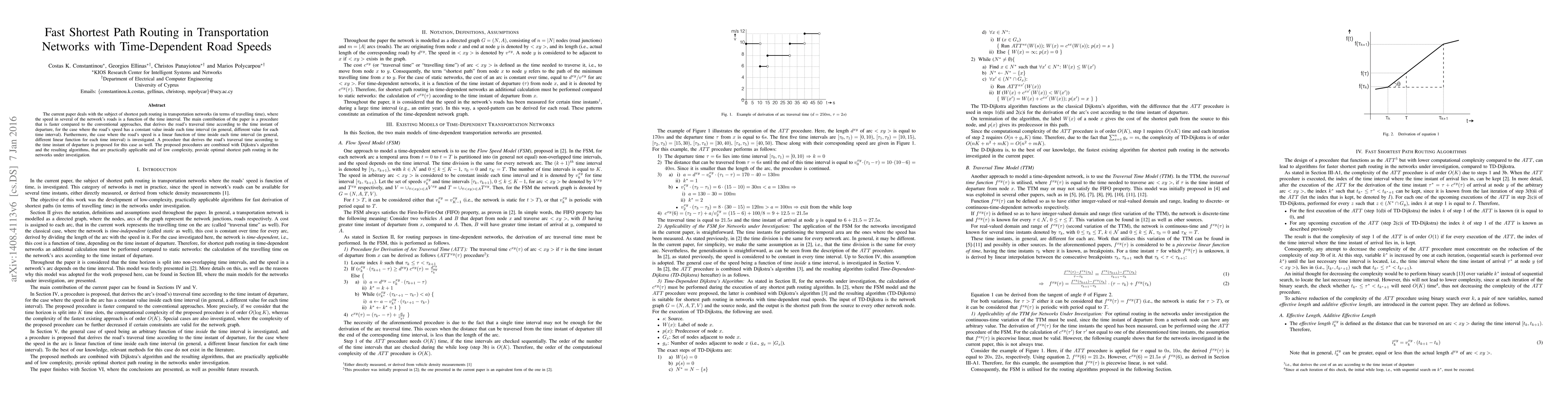 This paper proposes efficient algorithms for finding the shortest path in transportation networks where road speeds vary with time. The methods are faster than conventional approaches and handle both constant and linear time-dependent speed variations, integrating with Dijkstra's algorithm for optimal routing.