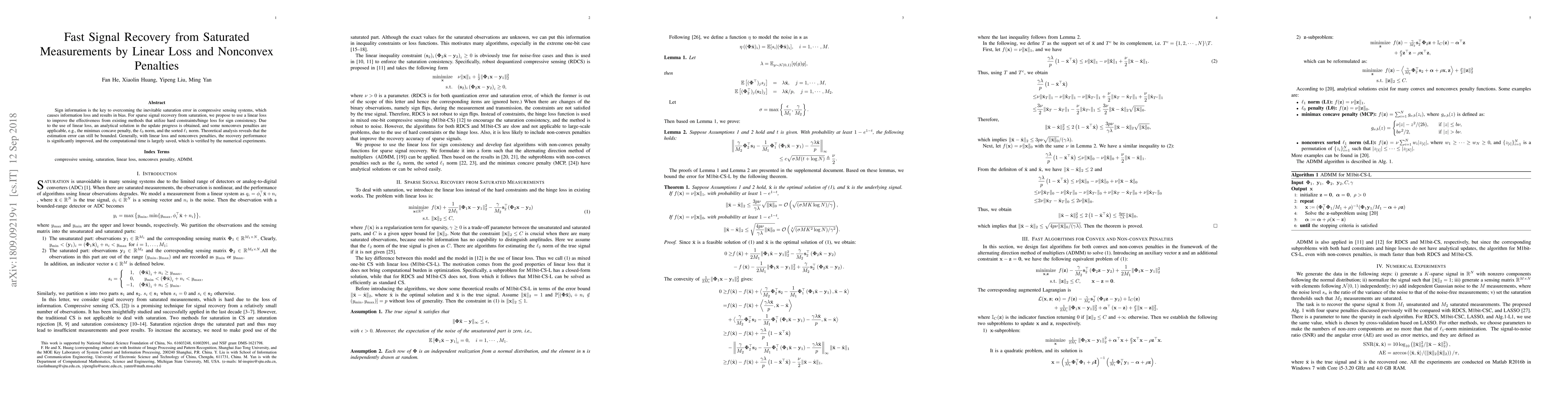 This paper proposes a method for fast signal recovery from saturated measurements in compressive sensing systems using linear loss and nonconvex penalties. The approach improves upon existing methods by leveraging linear loss for sign consistency, leading to an analytical solution and enhanced recovery performance, while also reducing computational time.