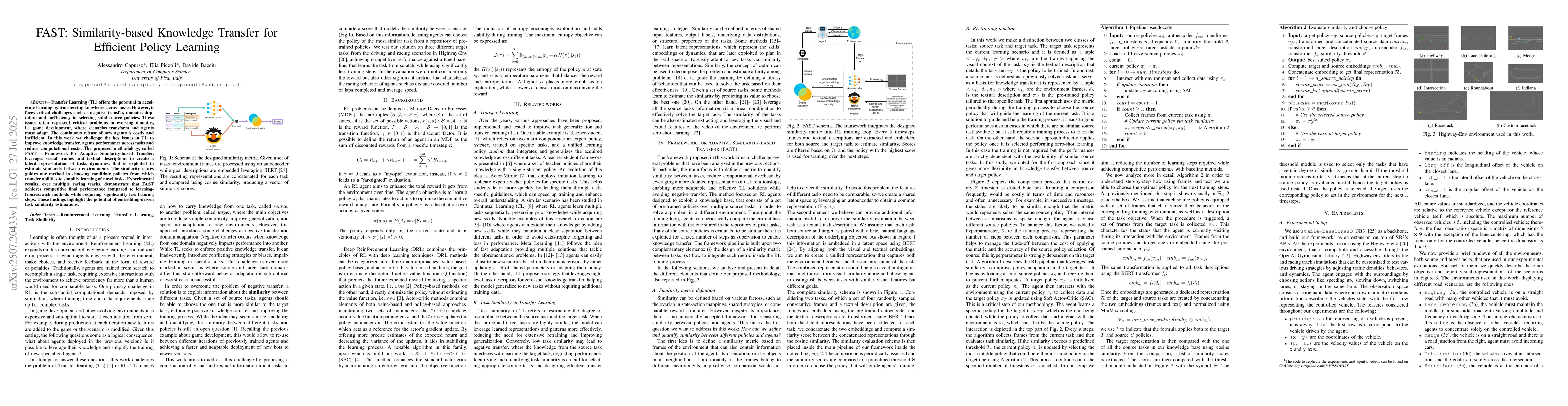 Transfer Learning (TL) offers the potential to accelerate learning by transferring knowledge across tasks. However, it faces critical challenges such as negative transfer, domain adaptation and inefficiency in selecting solid source policies. These issues often represent critical problems in evolving domains, i.e. game development, where scenarios transform and agents must adapt. The continuous release of new agents is costly and inefficient. In this work we challenge the key issues in TL to improve knowledge transfer, agents performance across tasks and reduce computational costs. The proposed methodology, called FAST - Framework for Adaptive Similarity-based Transfer, leverages visual frames and textual descriptions to create a latent representation of tasks dynamics, that is exploited to estimate similarity between environments. The similarity scores guides our method in choosing candidate policies from which transfer abilities to simplify learning of novel tasks. Experimental results, over multiple racing tracks, demonstrate that FAST achieves competitive final performance compared to learning-from-scratch methods while requiring significantly less training steps. These findings highlight the potential of embedding-driven task similarity estimations.