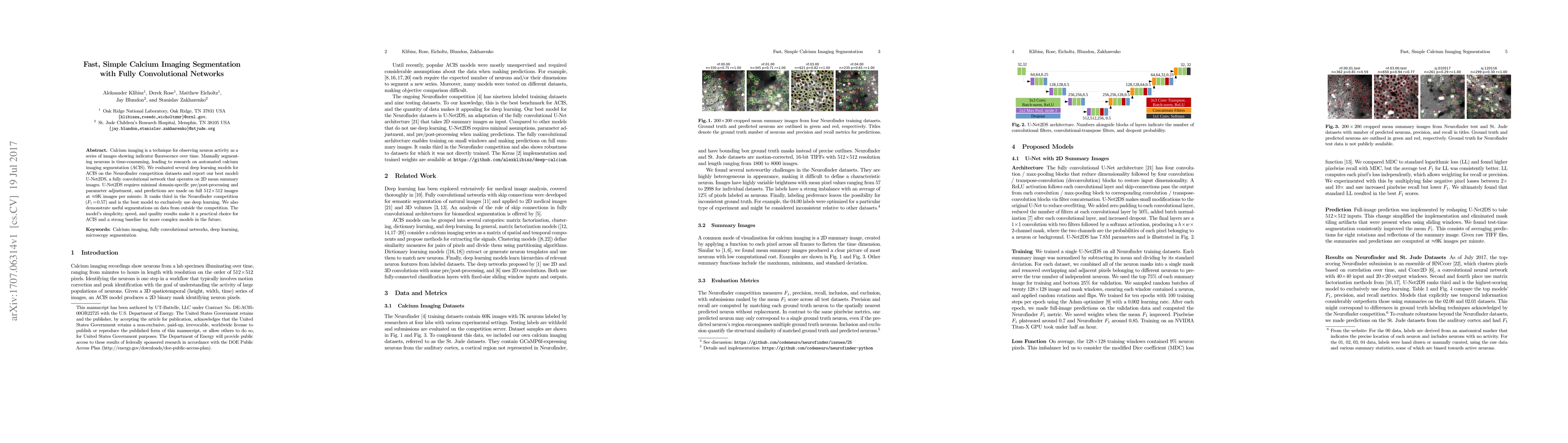 Calcium imaging is a technique for observing neuron activity as a series of images showing indicator fluorescence over time. Manually segmenting neurons is time-consuming, leading to research on automated calcium imaging segmentation (ACIS). We evaluated several deep learning models for ACIS on the Neurofinder competition datasets and report our best model: U-Net2DS, a fully convolutional network that operates on 2D mean summary images. U-Net2DS requires minimal domain-specific pre/post-processing and parameter adjustment, and predictions are made on full $512\times512$ images at $\approx$9K images per minute. It ranks third in the Neurofinder competition ($F_1=0.569$) and is the best model to exclusively use deep learning. We also demonstrate useful segmentations on data from outside the competition. The model's simplicity, speed, and quality results make it a practical choice for ACIS and a strong baseline for more complex models in the future.