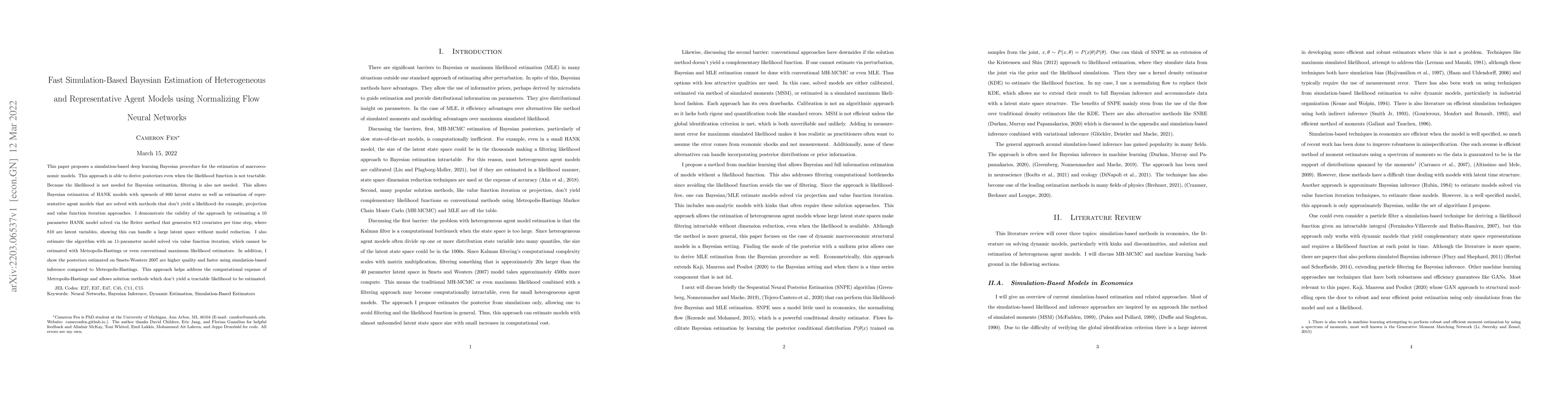 This paper proposes a simulation-based deep learning Bayesian procedure for the estimation of macroeconomic models. This approach is able to derive posteriors even when the likelihood function is not tractable. Because the likelihood is not needed for Bayesian estimation, filtering is also not needed. This allows Bayesian estimation of HANK models with upwards of 800 latent states as well as estimation of representative agent models that are solved with methods that don't yield a likelihood--for example, projection and value function iteration approaches. I demonstrate the validity of the approach by estimating a 10 parameter HANK model solved via the Reiter method that generates 812 covariates per time step, where 810 are latent variables, showing this can handle a large latent space without model reduction. I also estimate the algorithm with an 11-parameter model solved via value function iteration, which cannot be estimated with Metropolis-Hastings or even conventional maximum likelihood estimators. In addition, I show the posteriors estimated on Smets-Wouters 2007 are higher quality and faster using simulation-based inference compared to Metropolis-Hastings. This approach helps address the computational expense of Metropolis-Hastings and allows solution methods which don't yield a tractable likelihood to be estimated.