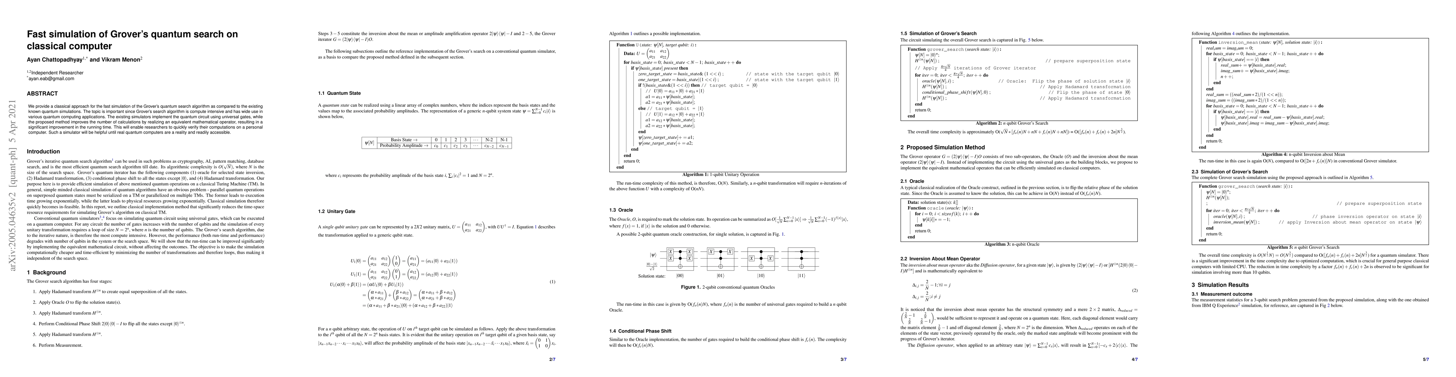 This paper presents an efficient method for simulating Grover's quantum search algorithm on classical computers, aiming to provide researchers with a faster alternative to existing simulators. The proposed approach demonstrates promising performance, facilitating quicker verification of quantum computing concepts and algorithms.