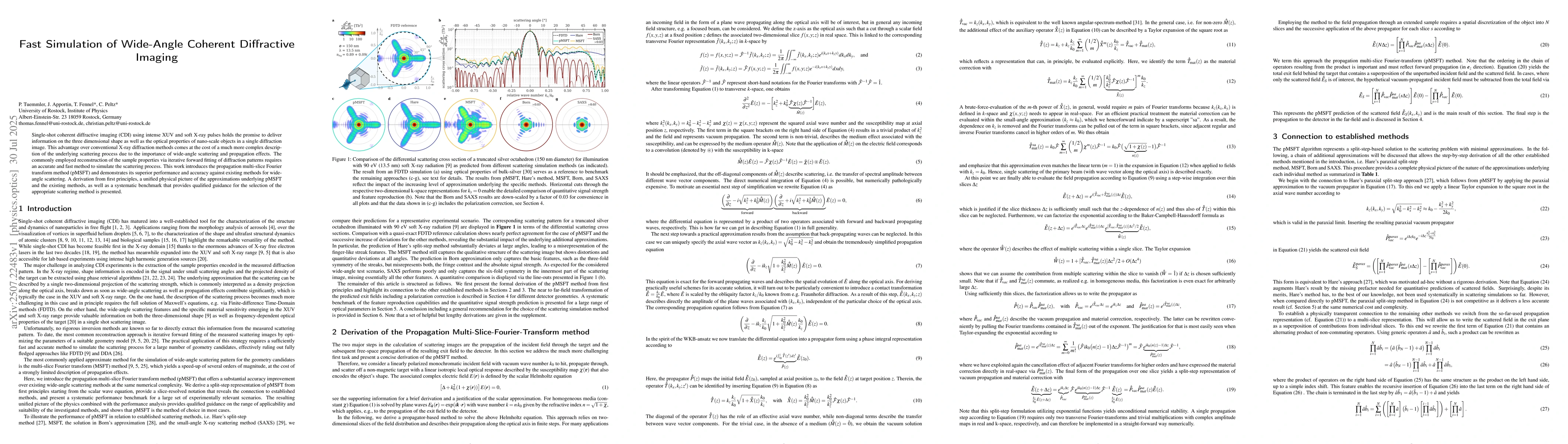 The research introduces the propagation multi-slice Fourier transform method (pMSFT) for simulating wide-angle scattering in coherent diffractive imaging, providing a unified physical picture of approximations in pMSFT and other methods like SAXS, Born, MSFT, and Hare's split-step method.