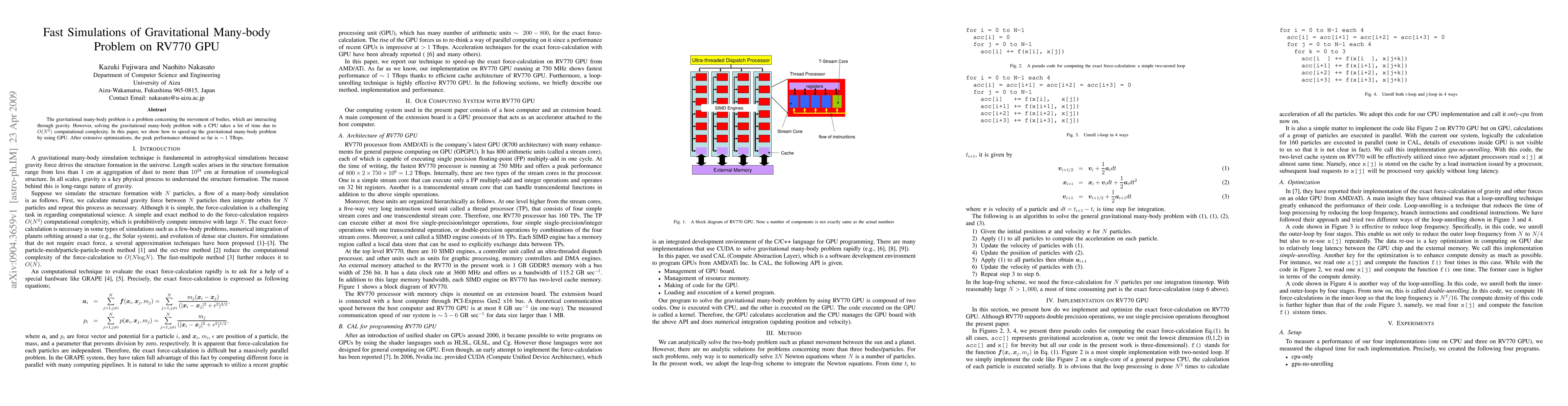 The gravitational many-body problem is a problem concerning the movement of bodies, which are interacting through gravity. However, solving the gravitational many-body problem with a CPU takes a lot of time due to O(N^2) computational complexity. In this paper, we show how to speed-up the gravitational many-body problem by using GPU. After extensive optimizations, the peak performance obtained so far is about 1 Tflops.