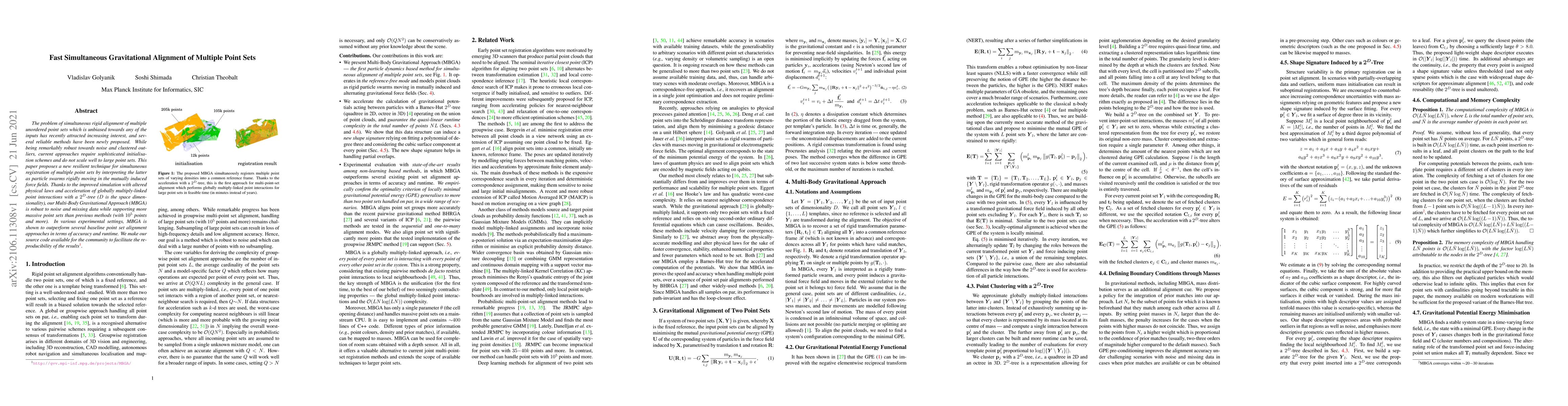 The problem of simultaneous rigid alignment of multiple unordered point sets which is unbiased towards any of the inputs has recently attracted increasing interest, and several reliable methods have been newly proposed. While being remarkably robust towards noise and clustered outliers, current approaches require sophisticated initialisation schemes and do not scale well to large point sets. This paper proposes a new resilient technique for simultaneous registration of multiple point sets by interpreting the latter as particle swarms rigidly moving in the mutually induced force fields. Thanks to the improved simulation with altered physical laws and acceleration of globally multiply-linked point interactions with a 2^D-tree (D is the space dimensionality), our Multi-Body Gravitational Approach (MBGA) is robust to noise and missing data while supporting more massive point sets than previous methods (with 10^5 points and more). In various experimental settings, MBGA is shown to outperform several baseline point set alignment approaches in terms of accuracy and runtime. We make our source code available for the community to facilitate the reproducibility of the results.