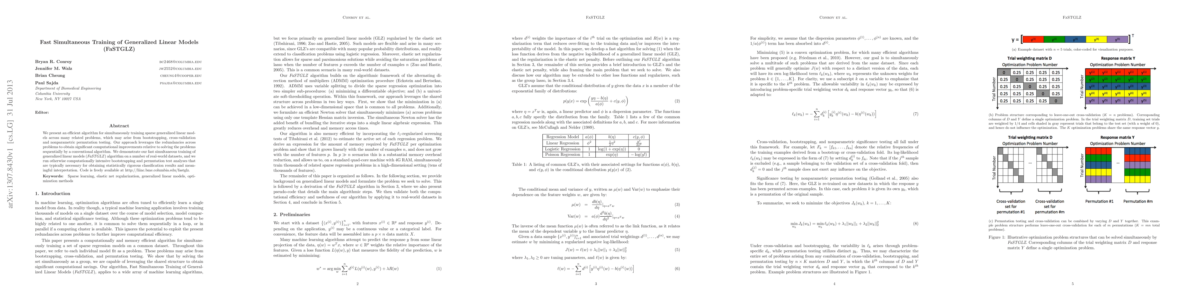 This paper introduces FaSTGLZ, an efficient algorithm for simultaneously training sparse generalized linear models across related problems, achieving significant computational gains over sequential methods. The authors demonstrate its effectiveness on real-world datasets, enabling intensive bootstrapping and permutation tests for rigorous classification analysis.