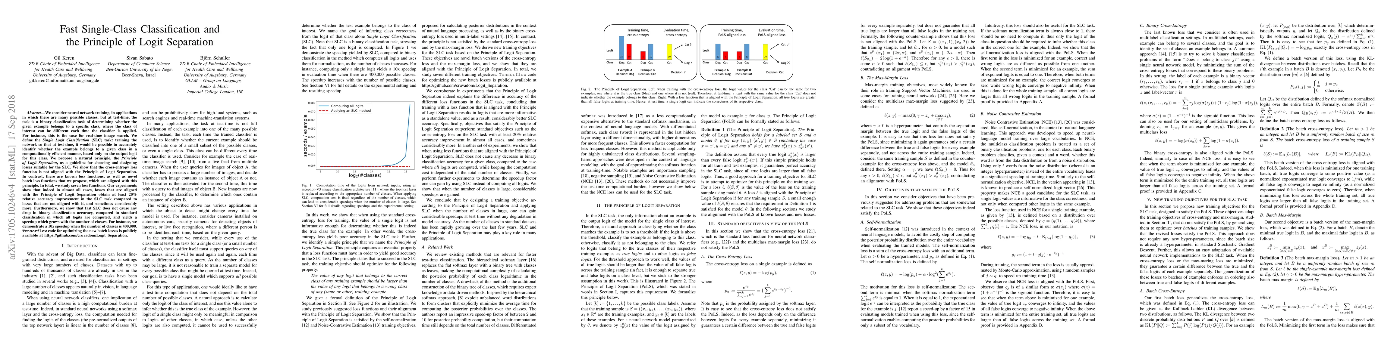 We consider neural network training, in applications in which there are many possible classes, but at test-time, the task is a binary classification task of determining whether the given example belongs to a specific class, where the class of interest can be different each time the classifier is applied. For instance, this is the case for real-time image search. We define the Single Logit Classification (SLC) task: training the network so that at test-time, it would be possible to accurately identify whether the example belongs to a given class in a computationally efficient manner, based only on the output logit for this class. We propose a natural principle, the Principle of Logit Separation, as a guideline for choosing and designing losses suitable for the SLC. We show that the cross-entropy loss function is not aligned with the Principle of Logit Separation. In contrast, there are known loss functions, as well as novel batch loss functions that we propose, which are aligned with this principle. In total, we study seven loss functions. Our experiments show that indeed in almost all cases, losses that are aligned with the Principle of Logit Separation obtain at least 20% relative accuracy improvement in the SLC task compared to losses that are not aligned with it, and sometimes considerably more. Furthermore, we show that fast SLC does not cause any drop in binary classification accuracy, compared to standard classification in which all logits are computed, and yields a speedup which grows with the number of classes. For instance, we demonstrate a 10x speedup when the number of classes is 400,000. Tensorflow code for optimizing the new batch losses is publicly available at https://github.com/cruvadom/Logit Separation.