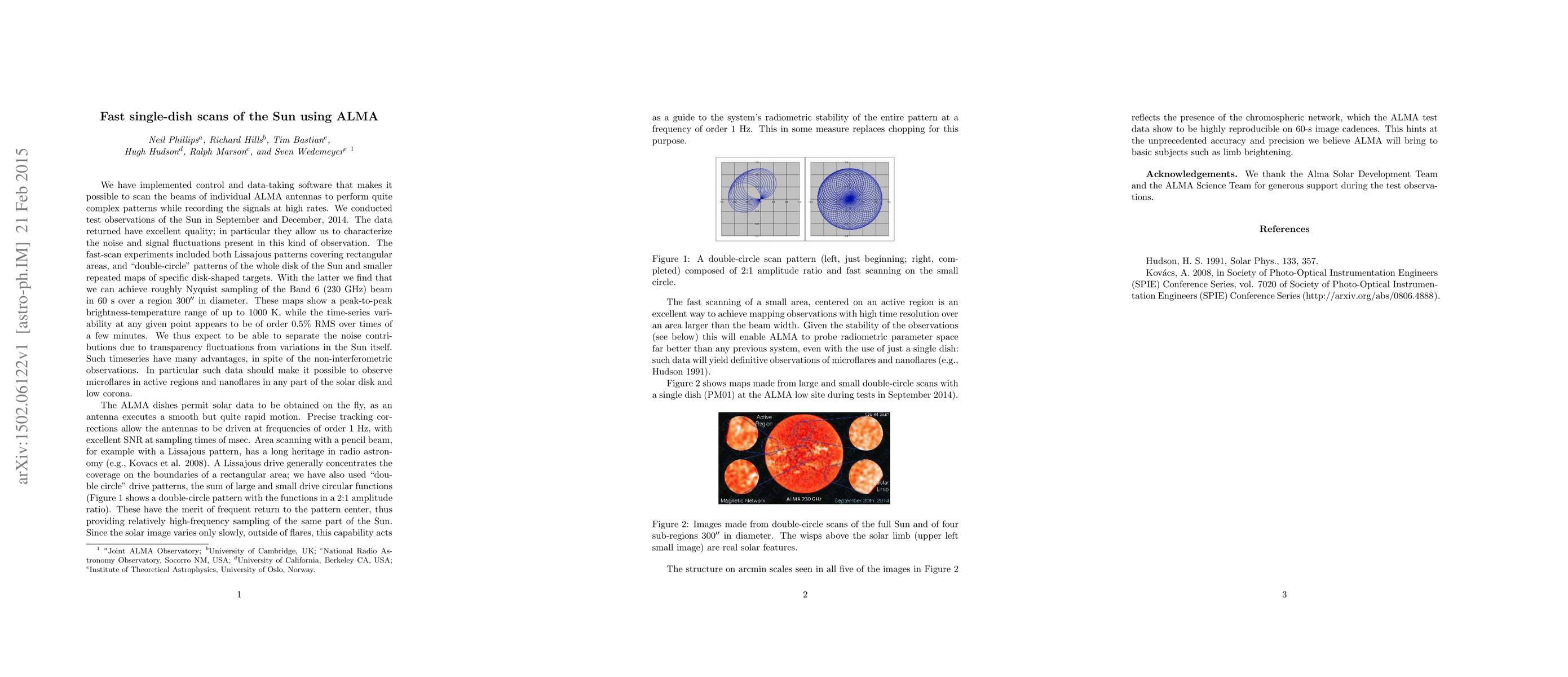 We have implemented control and data-taking software that makes it possible to scan the beams of individual ALMA antennas to perform quite complex patterns while recording the signals at high rates. We conducted test observations of the Sun in September and December, 2014. The data returned have excellent quality; in particular they allow us to characterize the noise and signal fluctuations present in this kind of observation. The fast-scan experiments included both Lissajous patterns covering rectangular areas, and double-circle patterns of the whole disk of the Sun and smaller repeated maps of specific disk-shaped targets. With the latter we find that we can achieve roughly Nyquist sampling of the Band~6 (230~GHz) beam in 60~s over a region 300$"$ in diameter. These maps show a peak-to-peak brightness-temperature range of up to 1000~K, while the time-series variability at any given point appears to be of order 0.5 percent RMS over times of a few minutes. We thus expect to be able to separate the noise contributions due to transparency fluctuations from variations in the Sun itself. Such timeseries have many advantages, in spite of the non-interferometric observations. In particular such data should make it possible to observe microflares in active regions and nanoflares in any part of the solar disk and low corona.