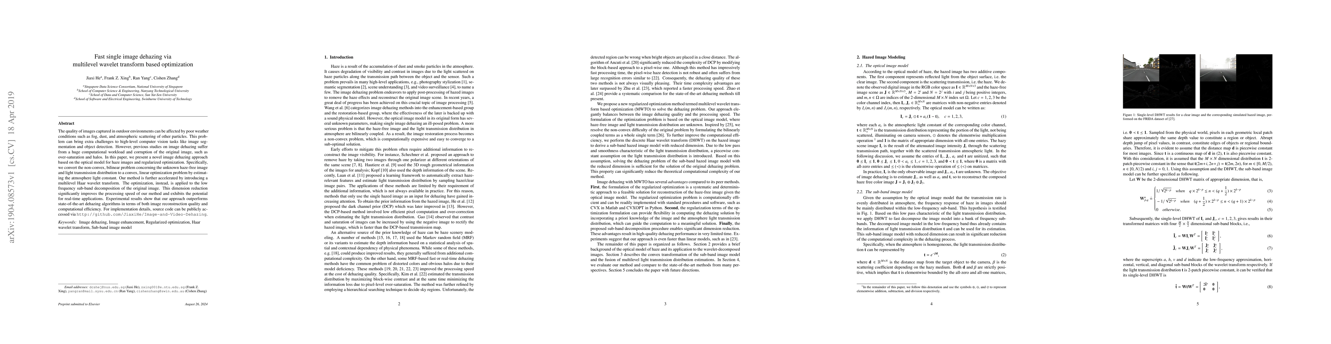 This paper proposes a fast single image dehazing method using multilevel Haar wavelet transform optimization, transforming a non-convex problem into a convex one to improve computational efficiency and reduce image distortion, outperforming existing algorithms. Source code is available for public access.