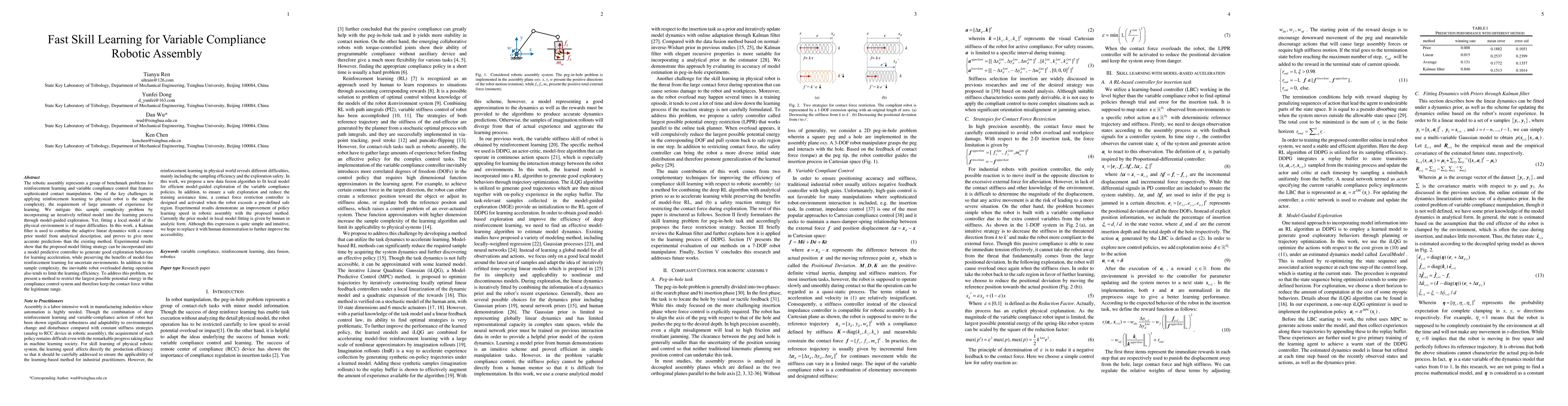 The robotic assembly represents a group of benchmark problems for reinforcement learning and variable compliance control that features sophisticated contact manipulation. One of the key challenges in applying reinforcement learning to physical robot is the sample complexity, the requirement of large amounts of experience for learning. We mitigate this sample complexity problem by incorporating an iteratively refitted model into the learning process through model-guided exploration. Yet, fitting a local model of the physical environment is of major difficulties. In this work, a Kalman filter is used to combine the adaptive linear dynamics with a coarse prior model from analytical description, and proves to give more accurate predictions than the existing method. Experimental results show that the proposed model fitting strategy can be incorporated into a model predictive controller to generate good exploration behaviors for learning acceleration, while preserving the benefits of model-free reinforcement learning for uncertain environments. In addition to the sample complexity, the inevitable robot overloaded during operation also tends to limit the learning efficiency. To address this problem, we present a method to restrict the largest possible potential energy in the compliance control system and therefore keep the contact force within the legitimate range.