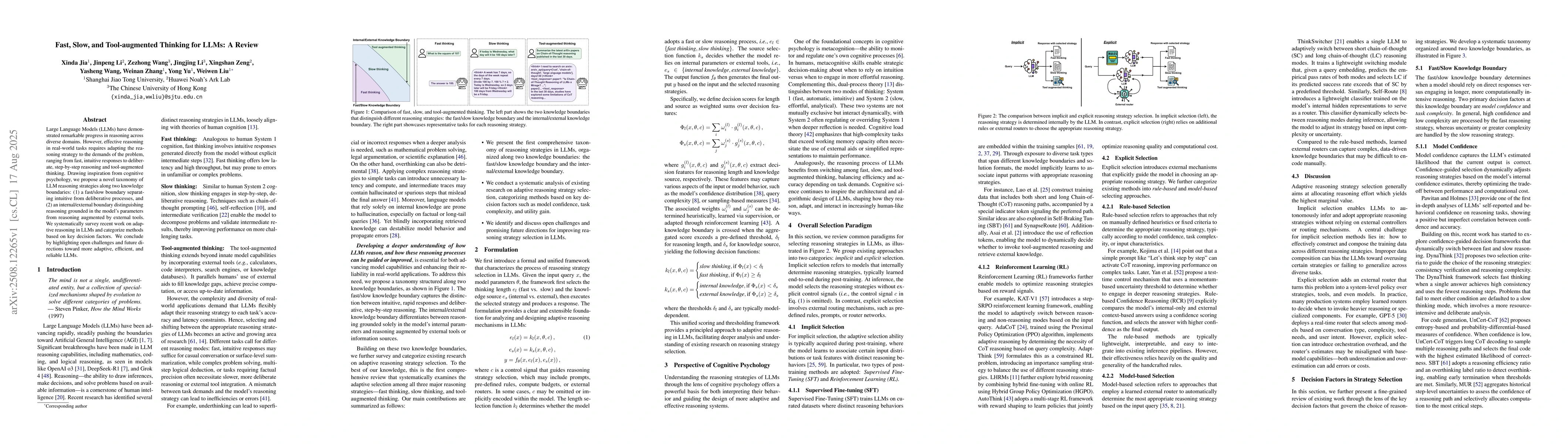 Large Language Models (LLMs) have demonstrated remarkable progress in reasoning across diverse domains. However, effective reasoning in real-world tasks requires adapting the reasoning strategy to the demands of the problem, ranging from fast, intuitive responses to deliberate, step-by-step reasoning and tool-augmented thinking. Drawing inspiration from cognitive psychology, we propose a novel taxonomy of LLM reasoning strategies along two knowledge boundaries: a fast/slow boundary separating intuitive from deliberative processes, and an internal/external boundary distinguishing reasoning grounded in the model's parameters from reasoning augmented by external tools. We systematically survey recent work on adaptive reasoning in LLMs and categorize methods based on key decision factors. We conclude by highlighting open challenges and future directions toward more adaptive, efficient, and reliable LLMs.