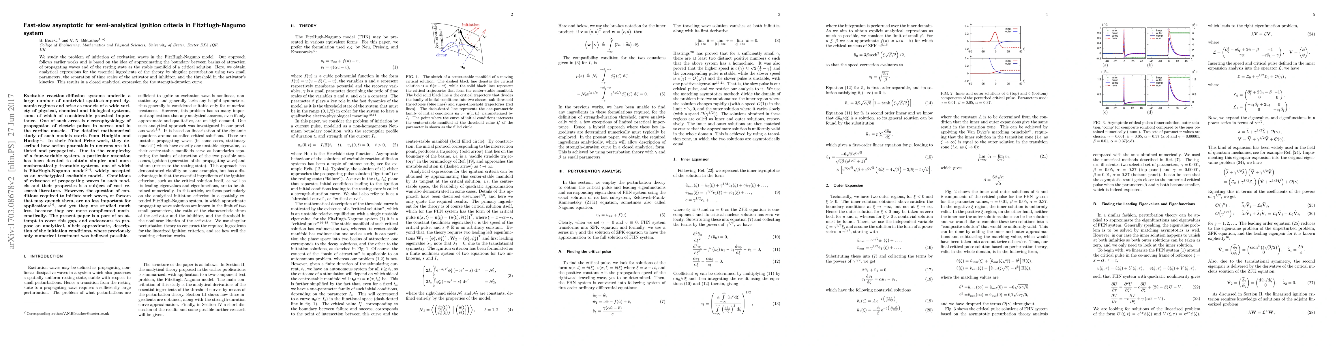 We study the problem of initiation of excitation waves in the FitzHugh-Nagumo model. Our approach follows earlier works and is based on the idea of approximating the boundary between basins of attraction of propagating waves and of the resting state as the stable manifold of a critical solution. Here, we obtain analytical expressions for the essential ingredients of the theory by singular perturbation using two small parameters, the separation of time scales of the activator and inhibitor, and the threshold in the activator's kinetics. This results in a closed analytical expression for the strength-duration curve.